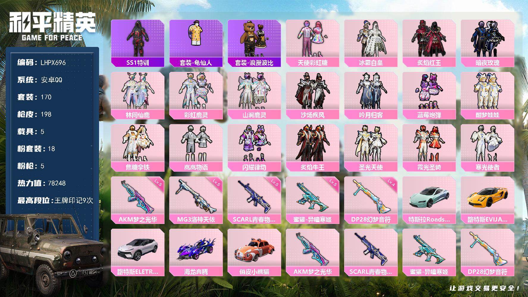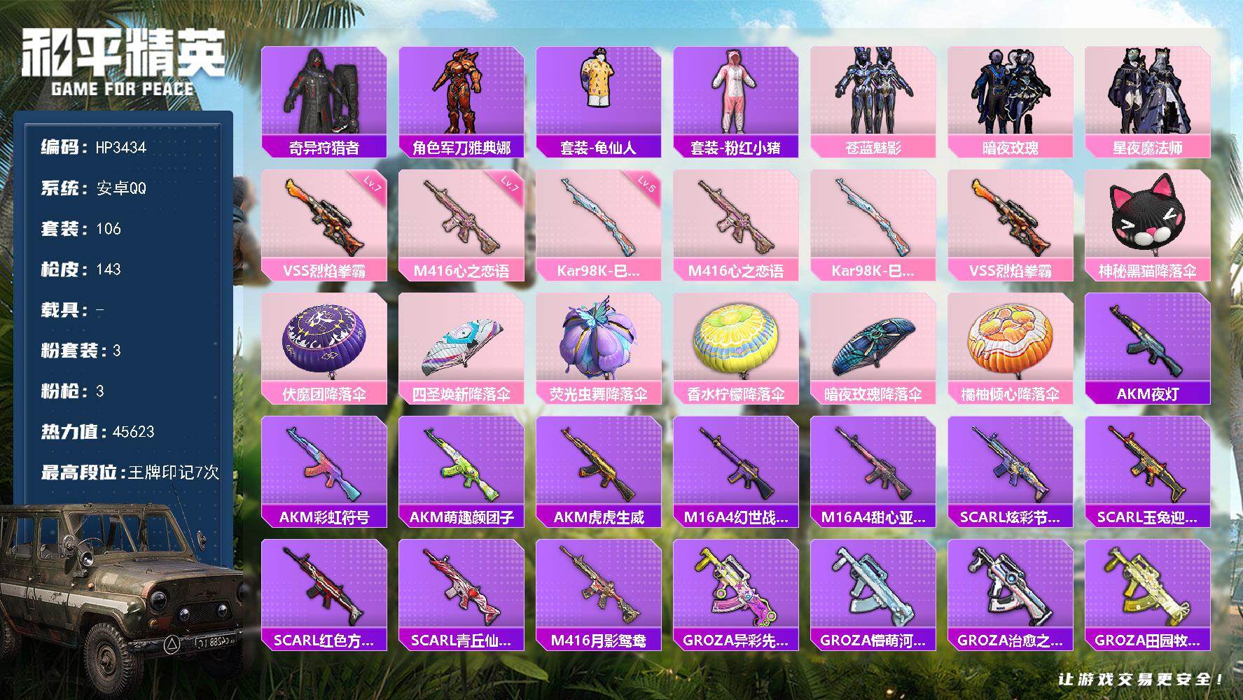 安卓 手Q-3粉装-3特效枪-0载具-0粉色飞行器-45623热力值-7王牌印