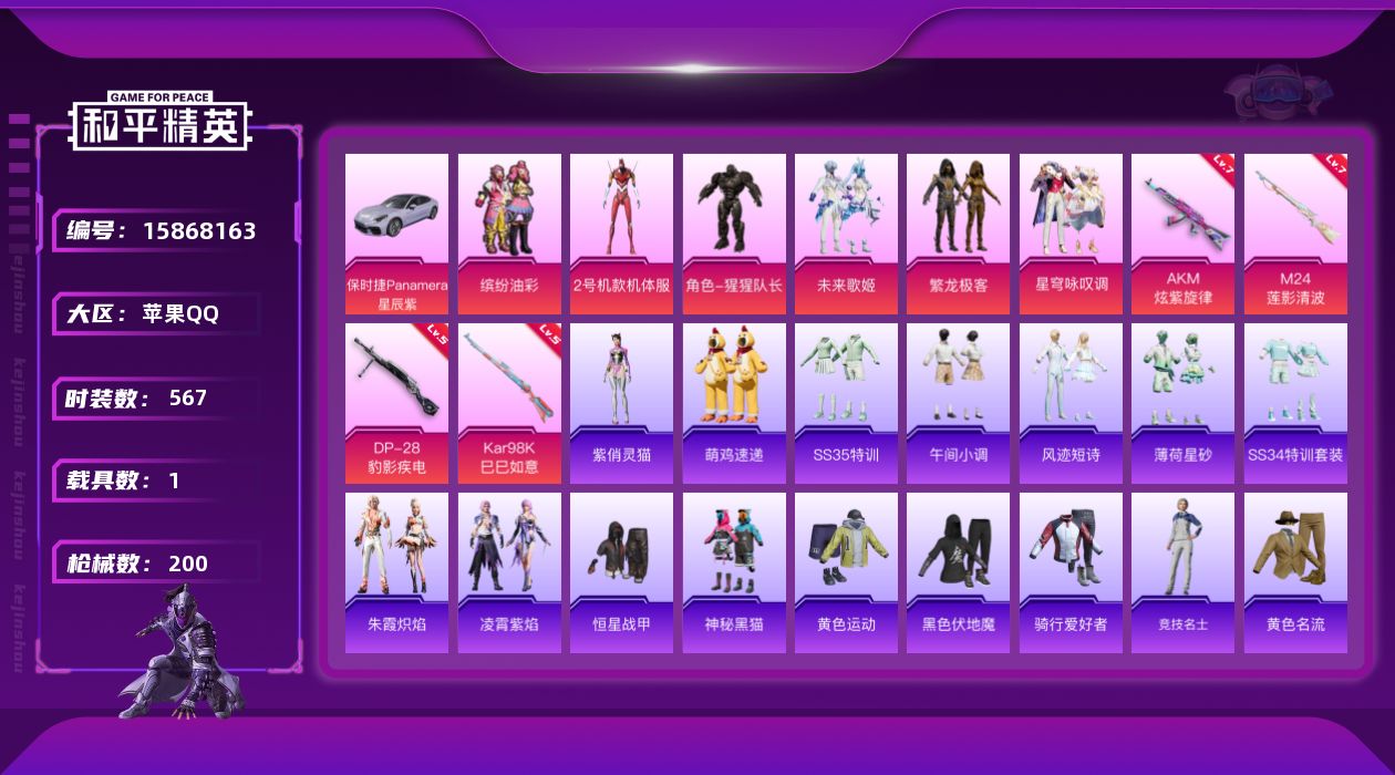 6粉装 4特效枪 1载具 1印记 可二次 可修改实名 【热门装扮】:2号机款机