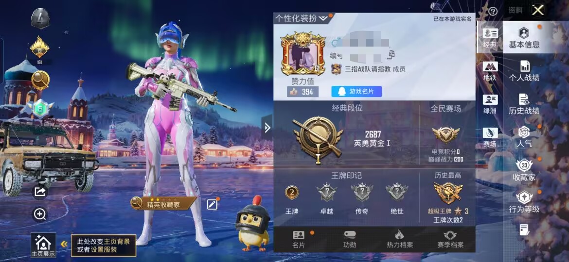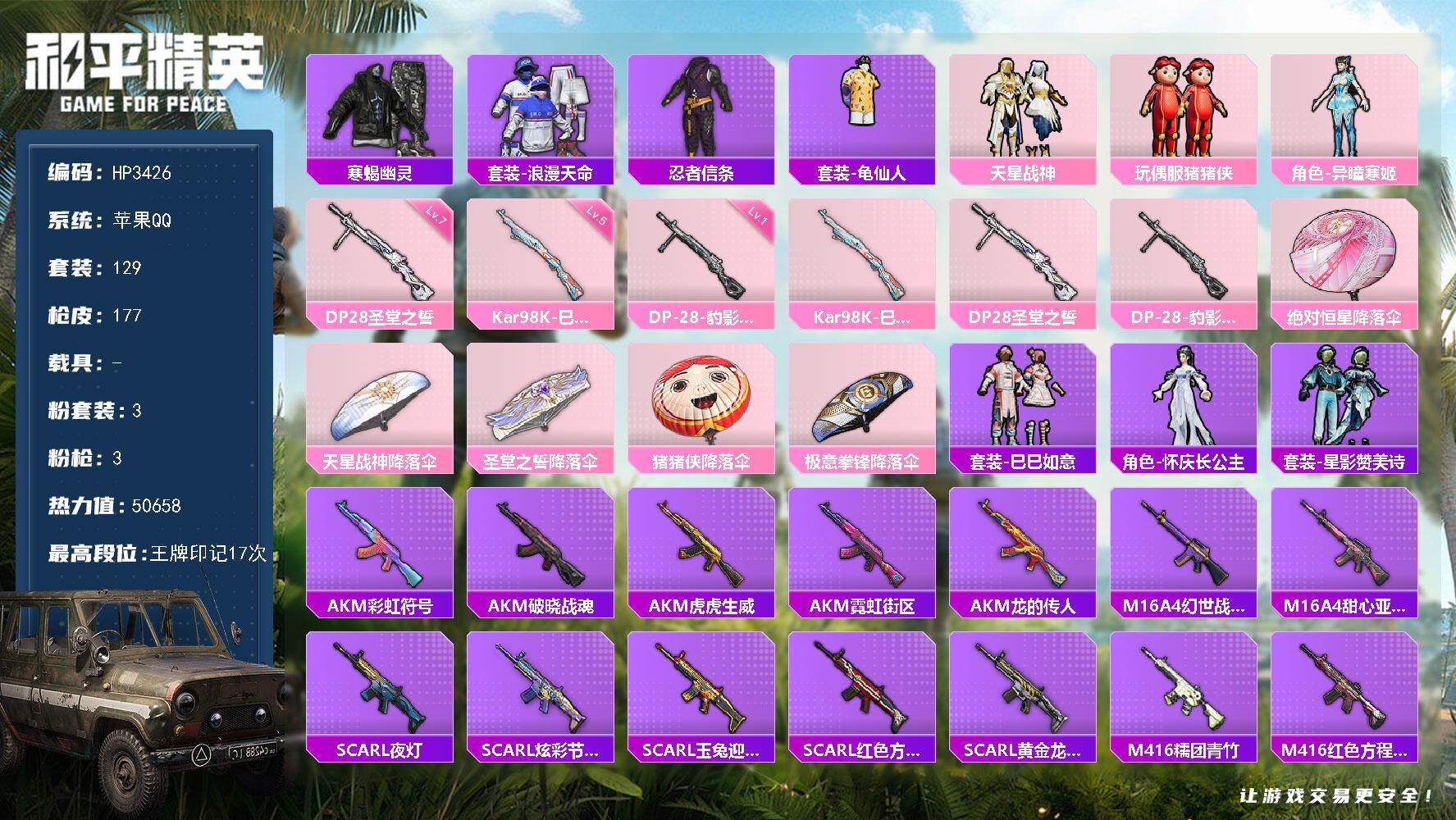 苹果,手Q-3粉装-3特效枪-0载具-1粉色飞行器-50658热力值-17王牌