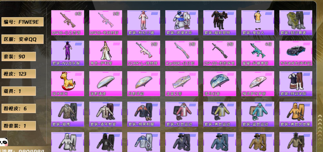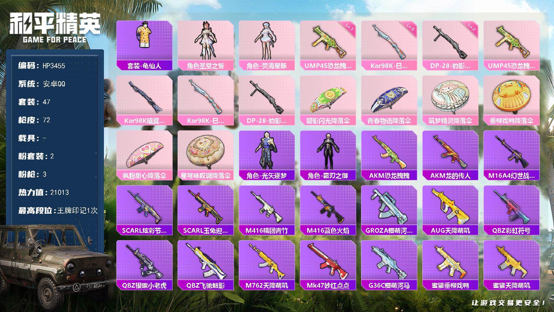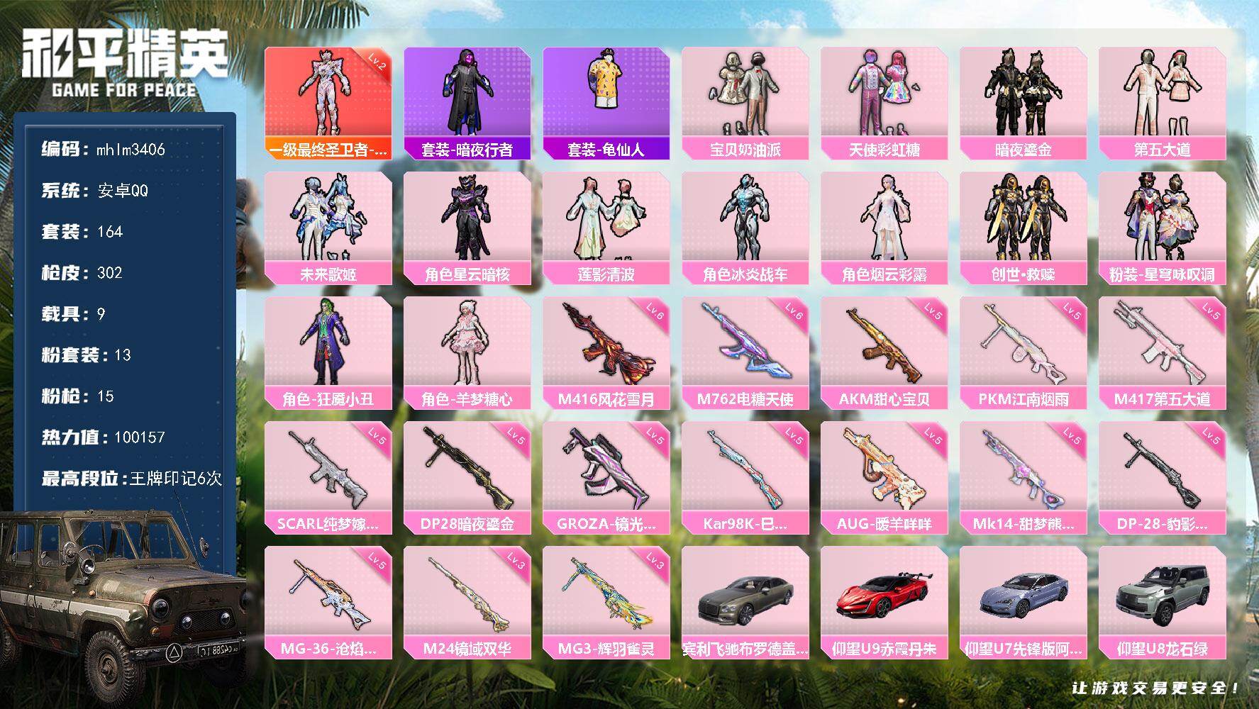 a4236/安卓QQ/热力值:49001,3粉装,3粉枪,5载具,8粉色战备,100套装,134枪械