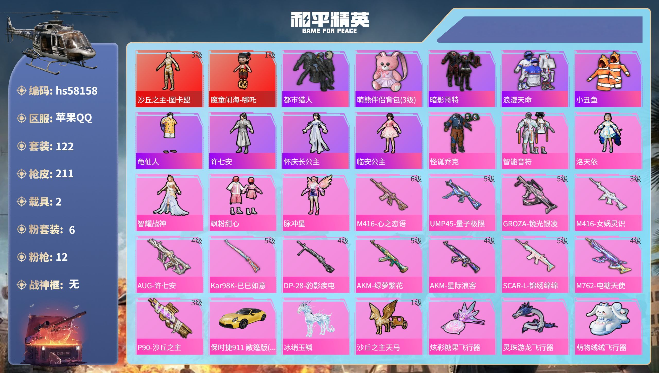 hs58117 苹果手Q-11王牌印记-5粉装-6特效枪-1载具-72876热力值-190套装-23