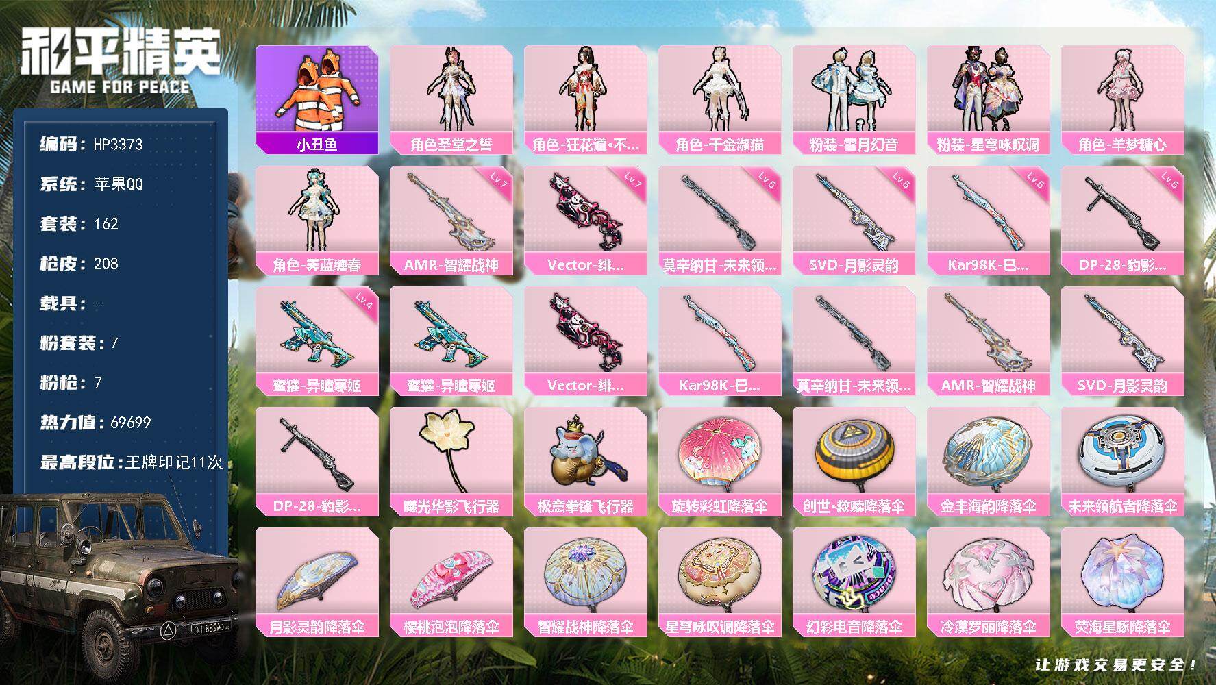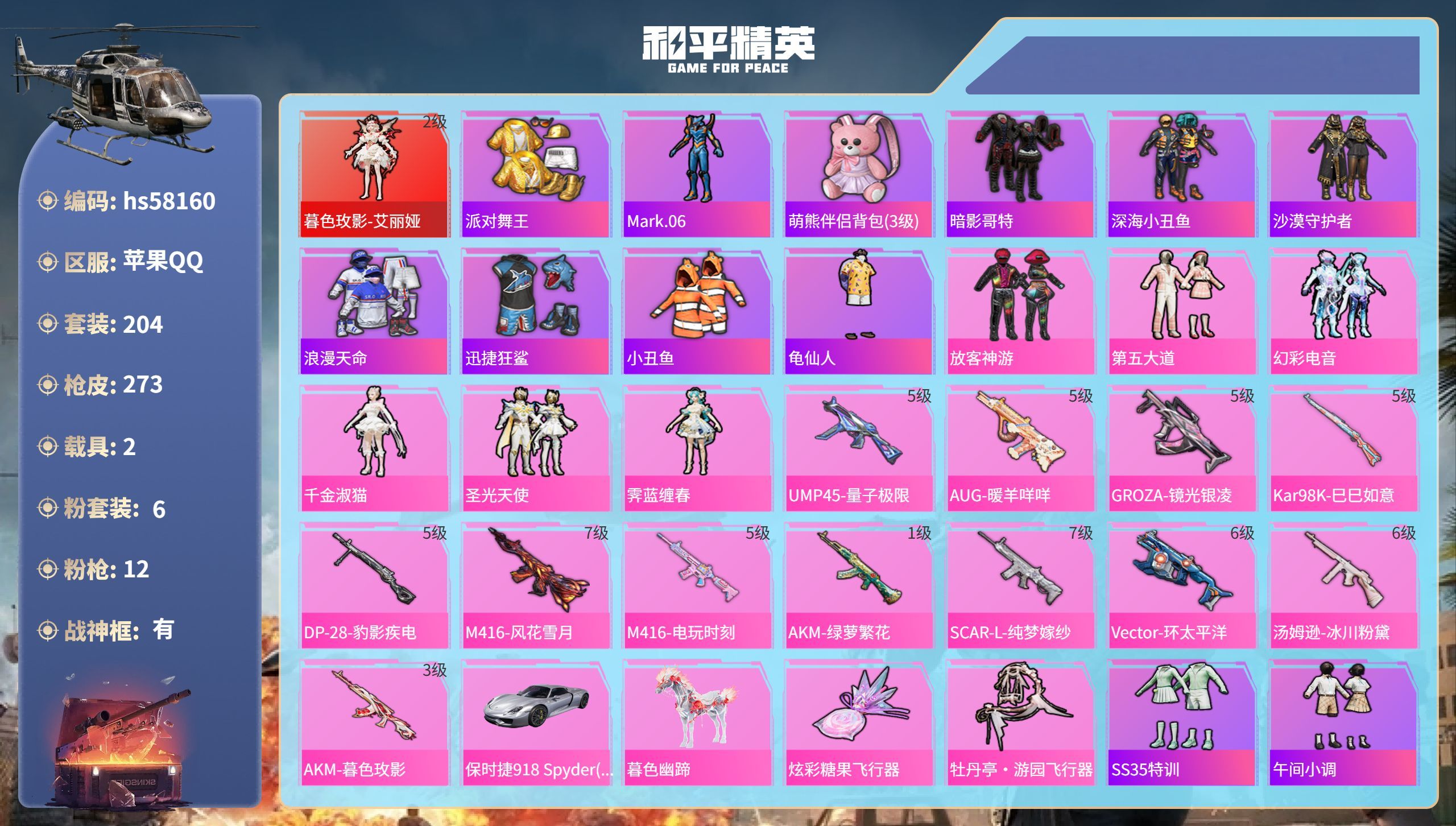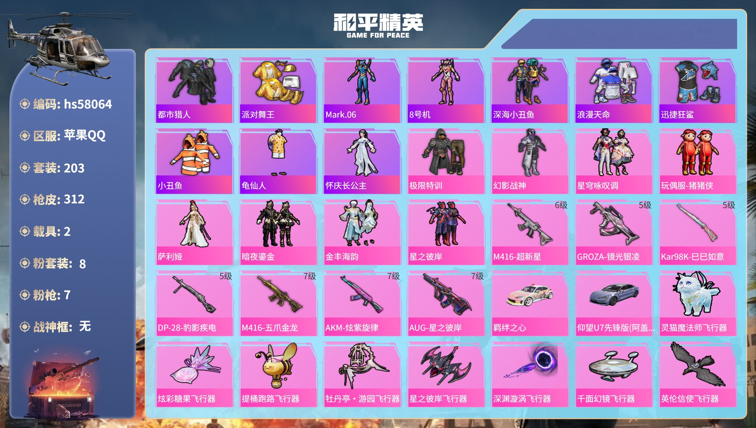 hs58064 苹果手Q-18王牌印记-8粉装-7特效枪-2载具-98838热力值-203套装-31