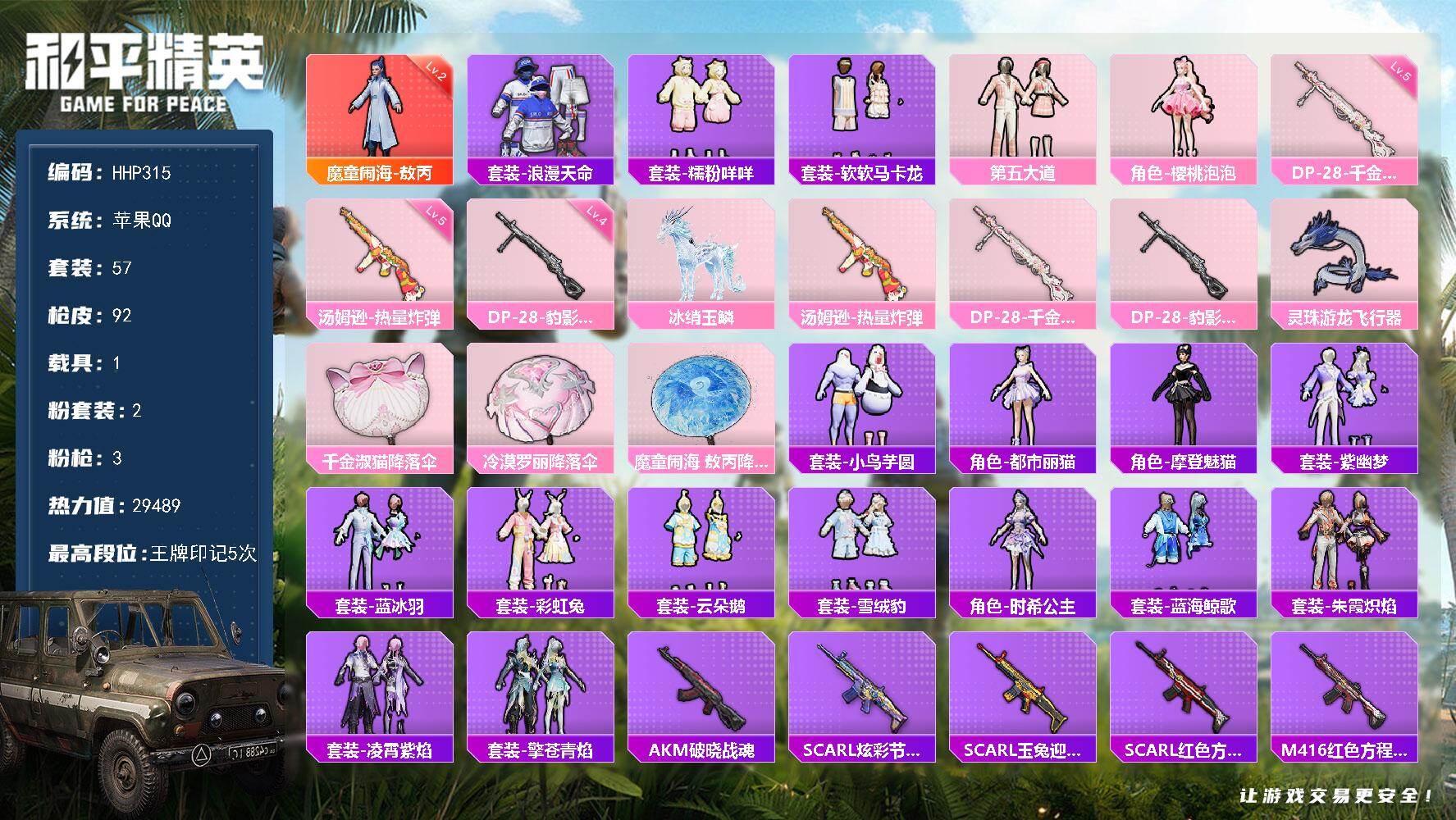 hs58089 苹果手Q-30王牌印记-有战神框-17粉装-14特效枪-2载具-132548热力值-
