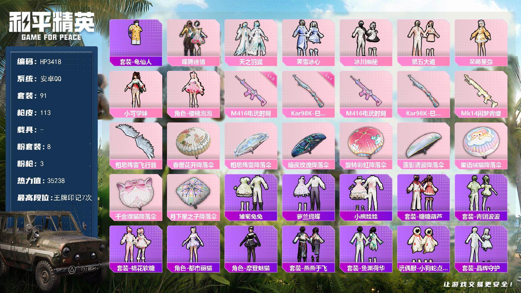 安卓 手Q-8粉装-3特效枪-0载具-1粉色飞行器-35238热力值-7王牌印