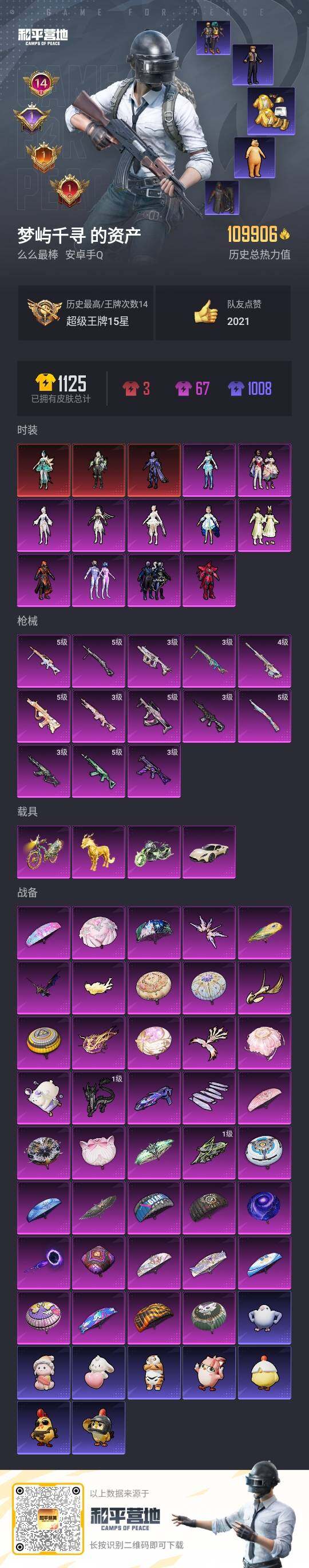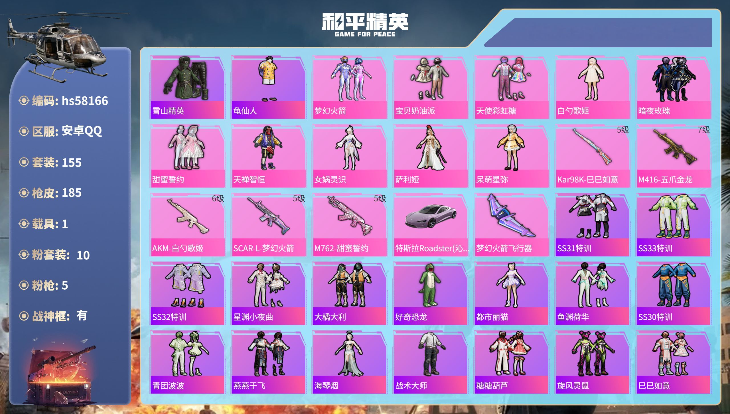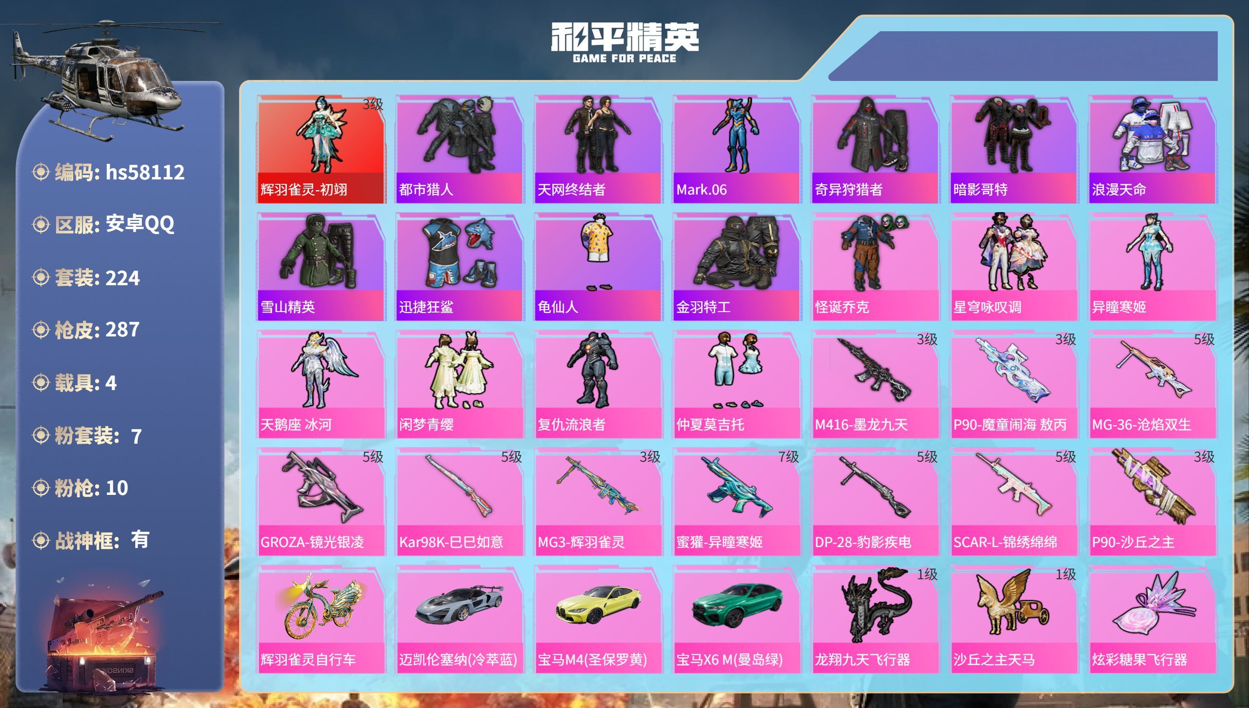 hs58166 安卓手Q-21王牌印记-有战神框-10粉装-5特效枪-1载具-65001热力值-15