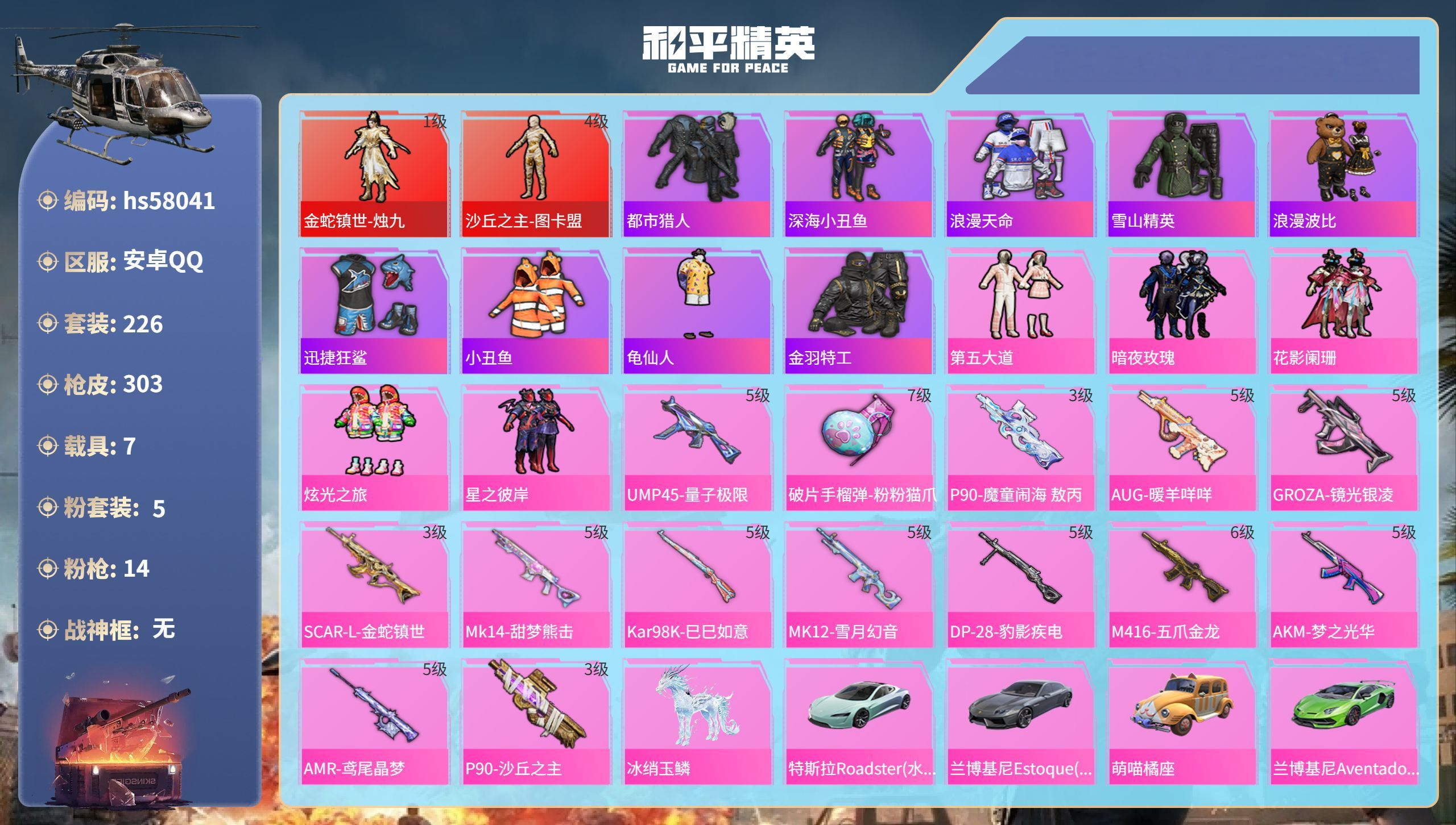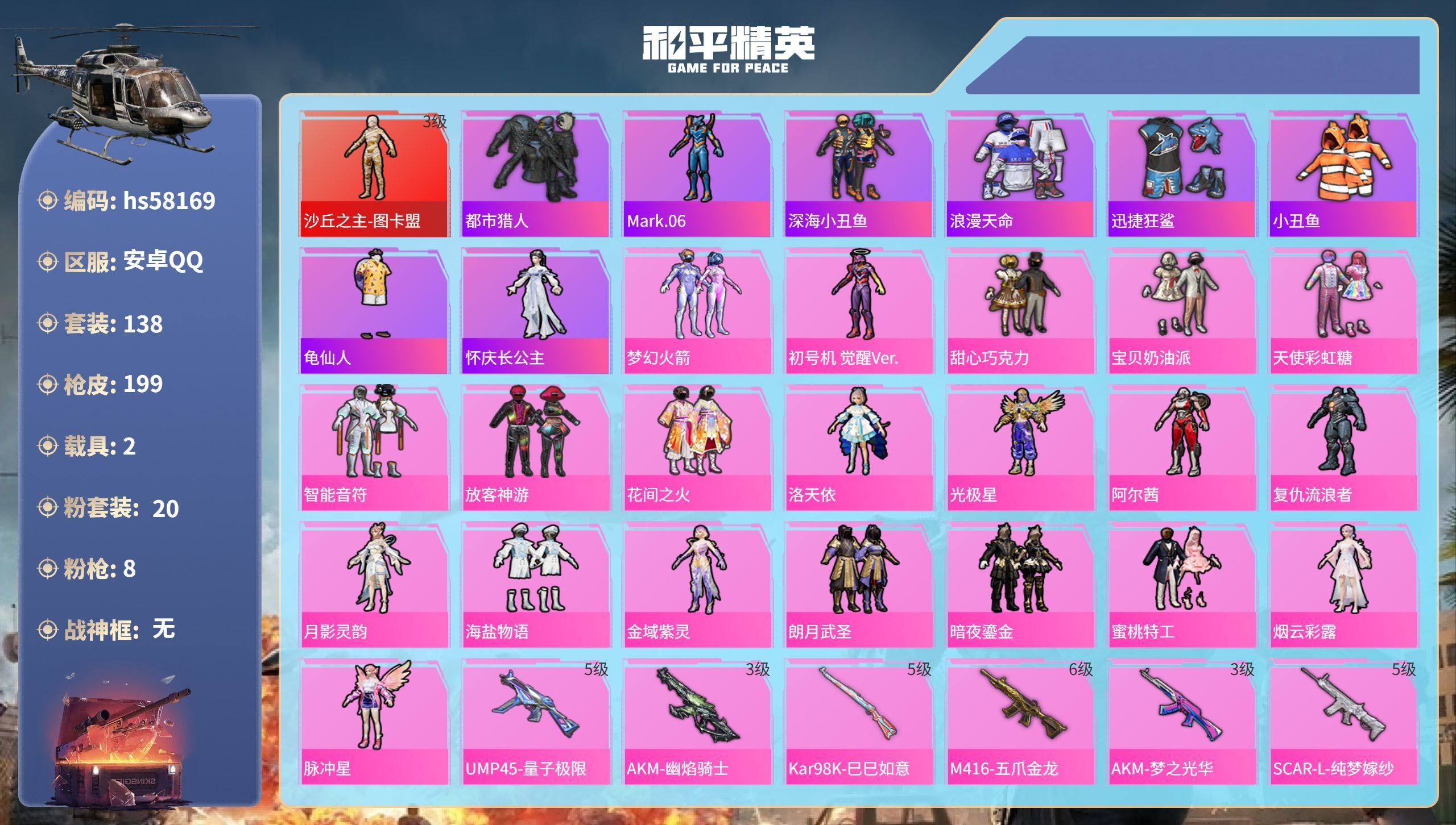 hs58169 安卓手Q-4王牌印记-1红装-20粉装-8特效枪-2载具-73896热力值-138套