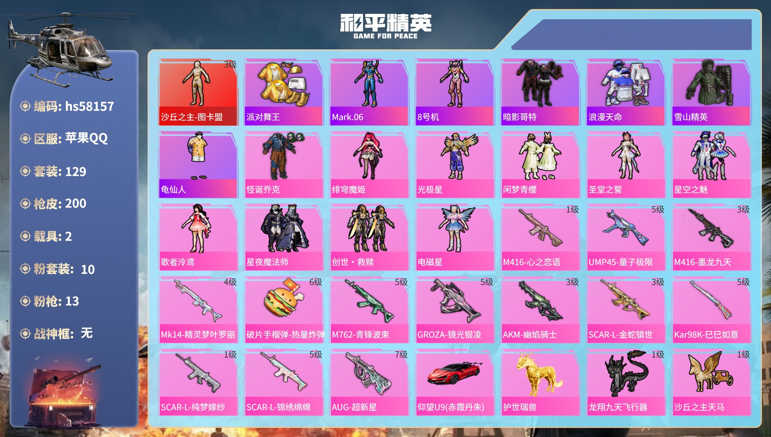hs58157 苹果手Q-10王牌印记-1红装-10粉装-13特效枪-2载具-73283热力值-12