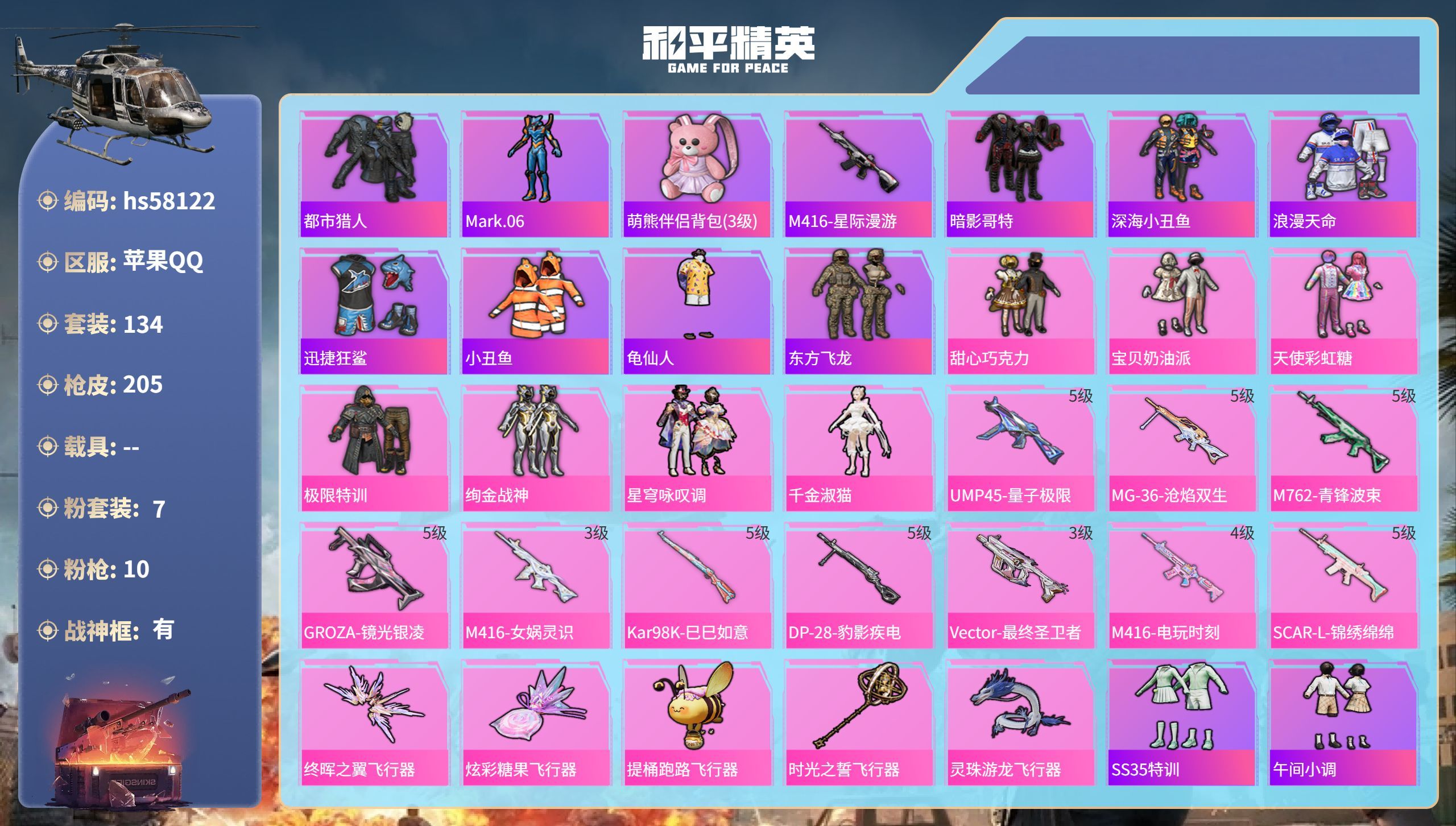 hs58122 苹果手Q-10王牌印记-有战神框-7粉装-10特效枪-59892热力值-134套装-