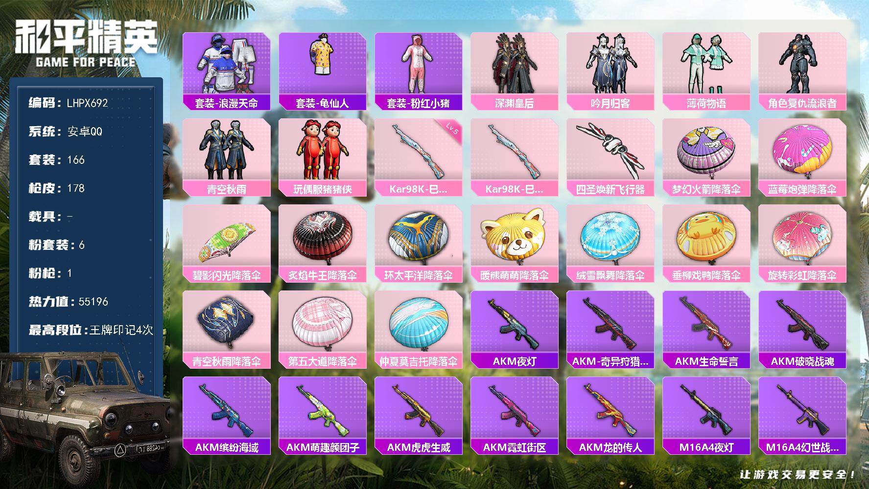 hs58165 安卓手Q-0王牌印记-4粉装-4特效枪-1载具-49334热力值-99套装-190枪