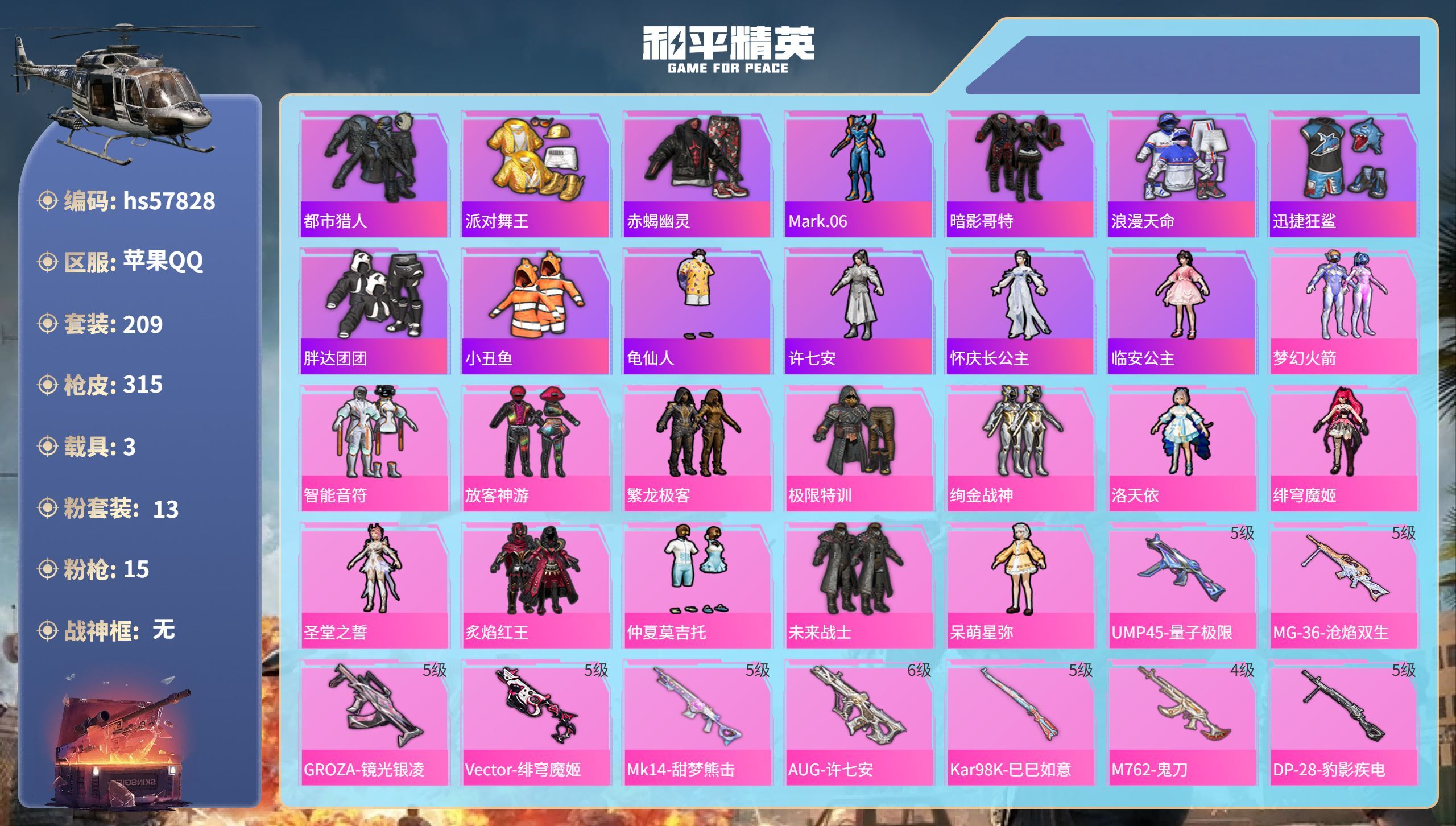 hs57828 苹果手Q-17王牌印记-13粉装-15特效枪-3载具-101368热力值-209套装