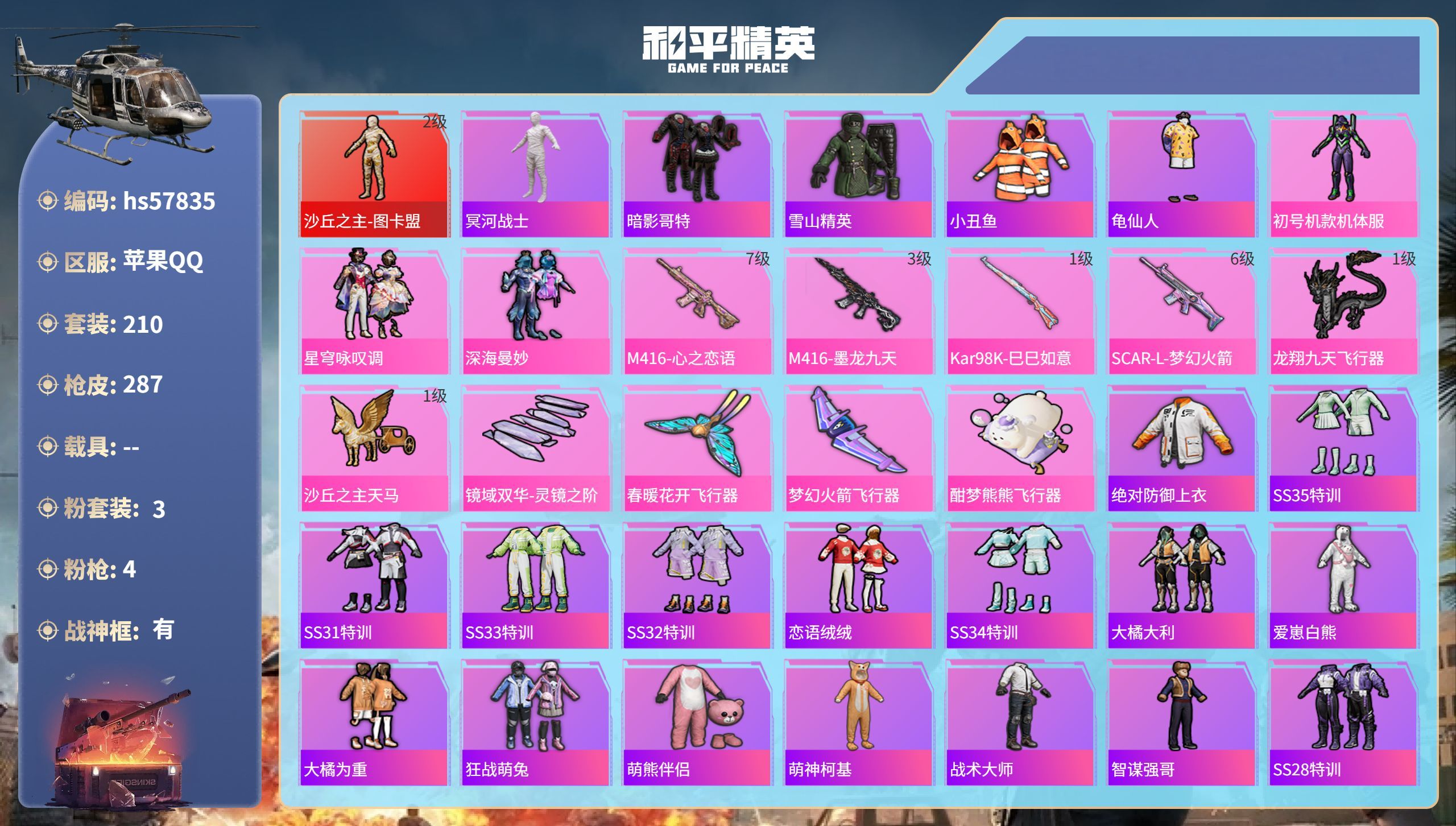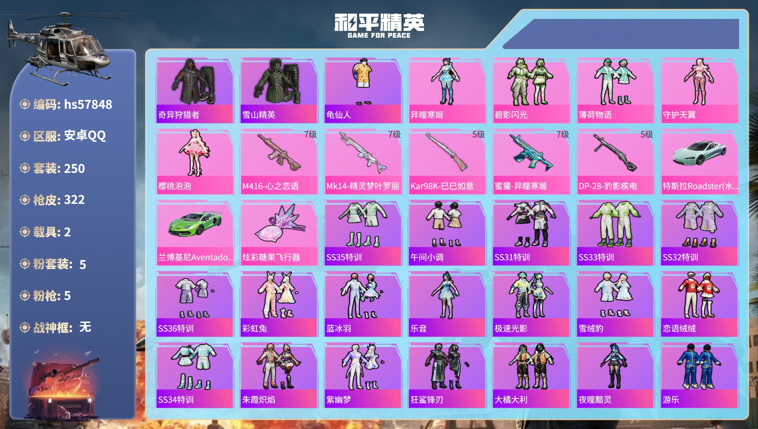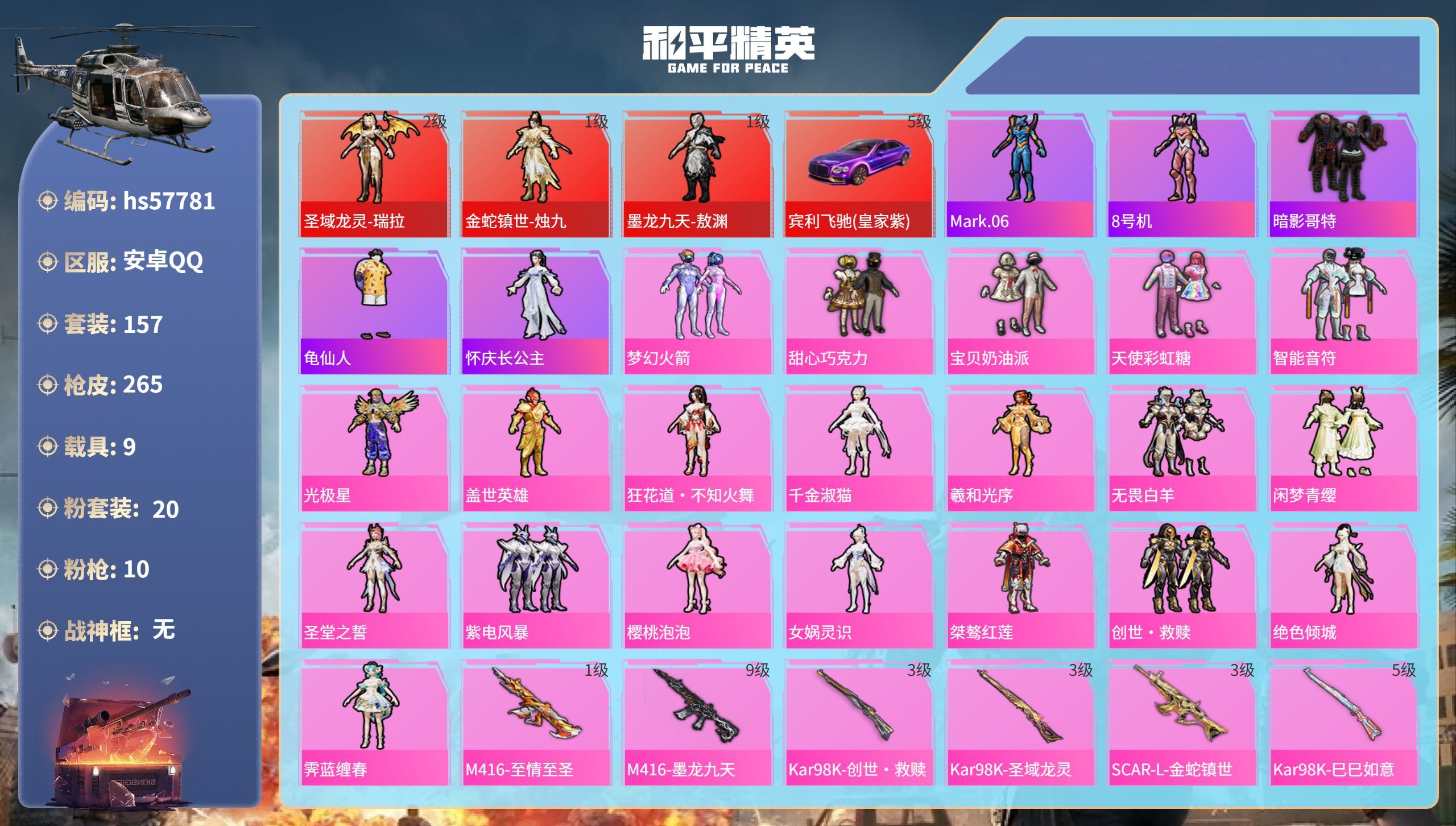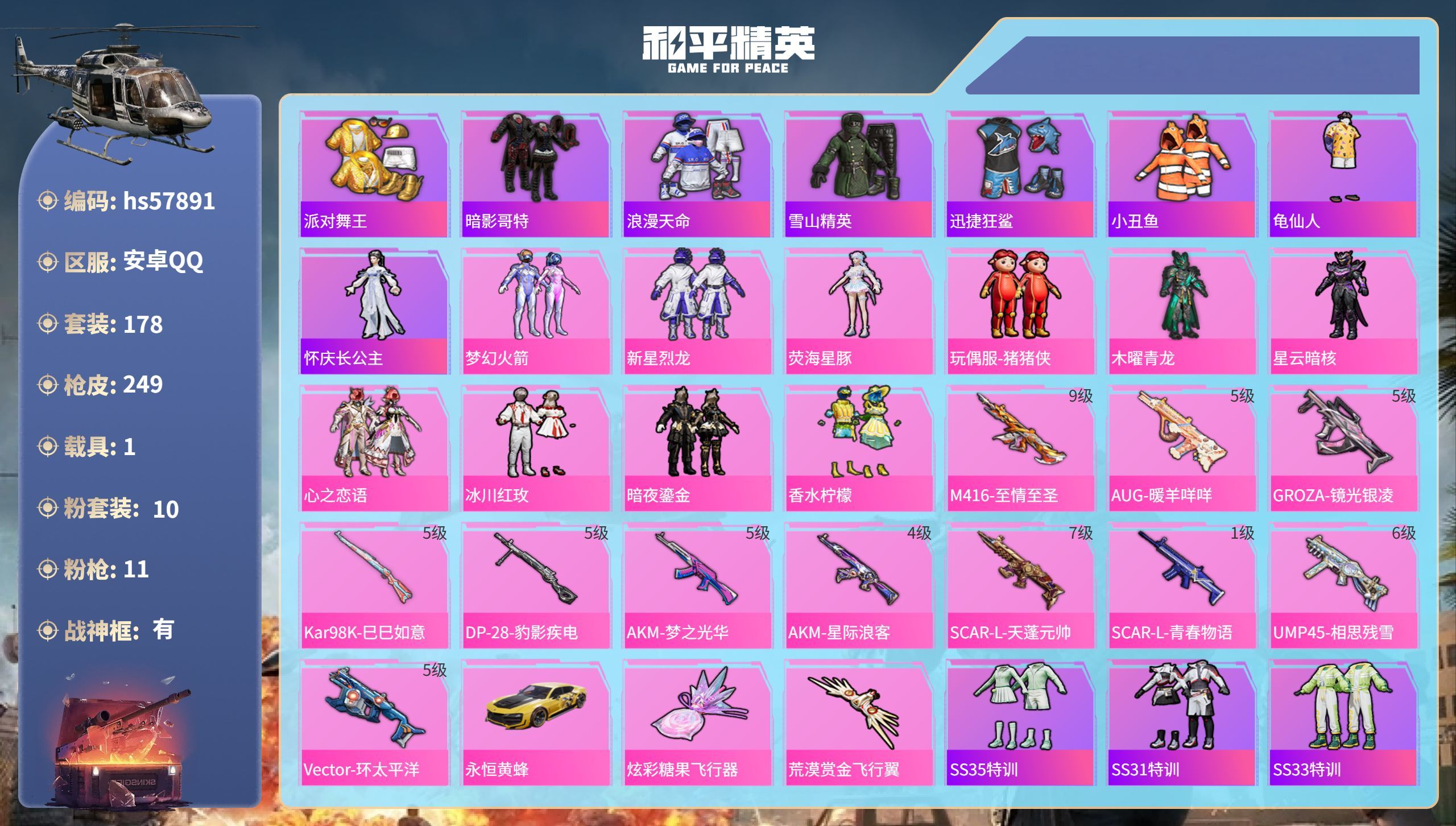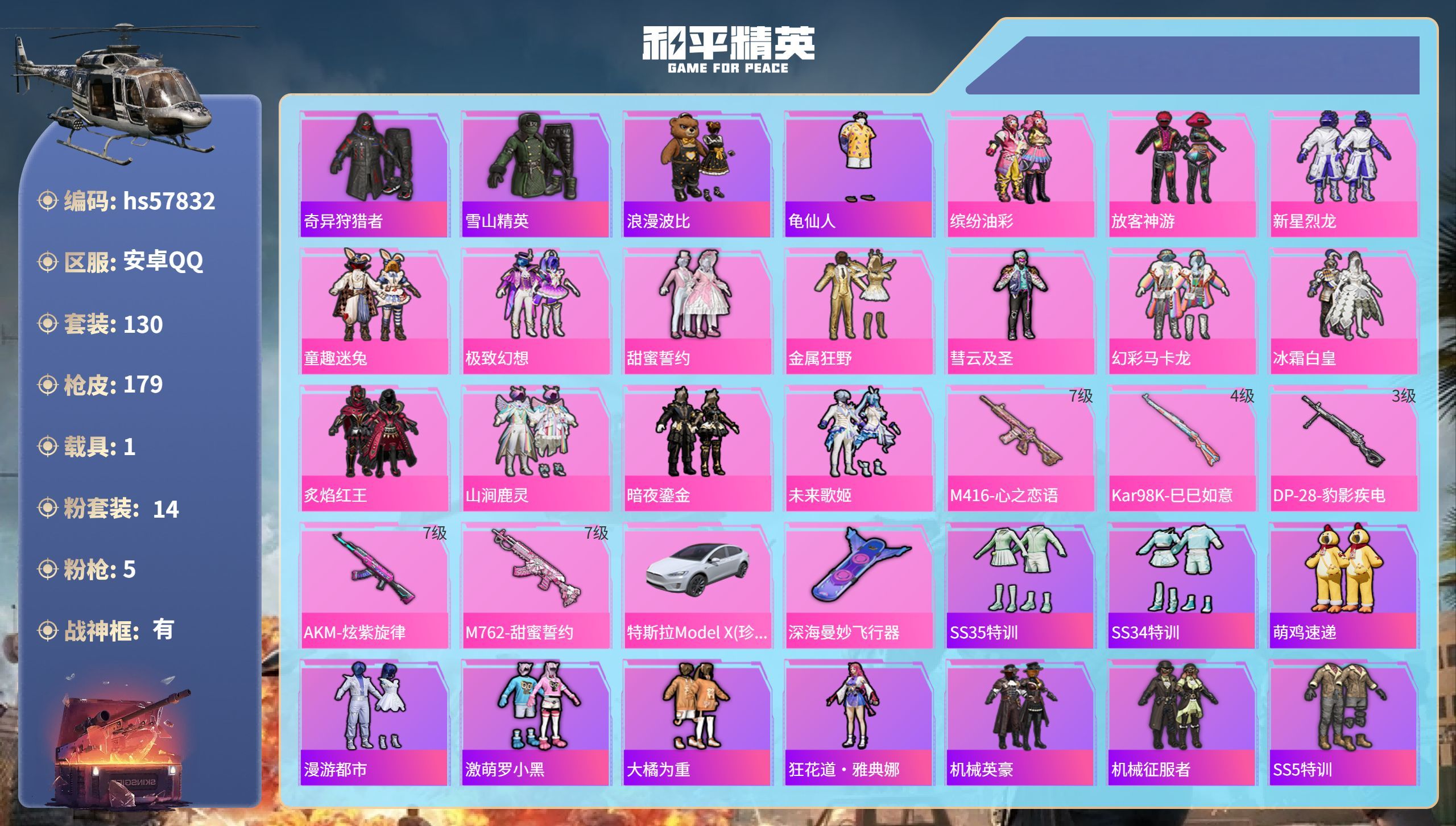 hs57870 安卓手Q-4王牌印记-4粉装-4特效枪-1载具-19900热力值-34套装-55枪皮