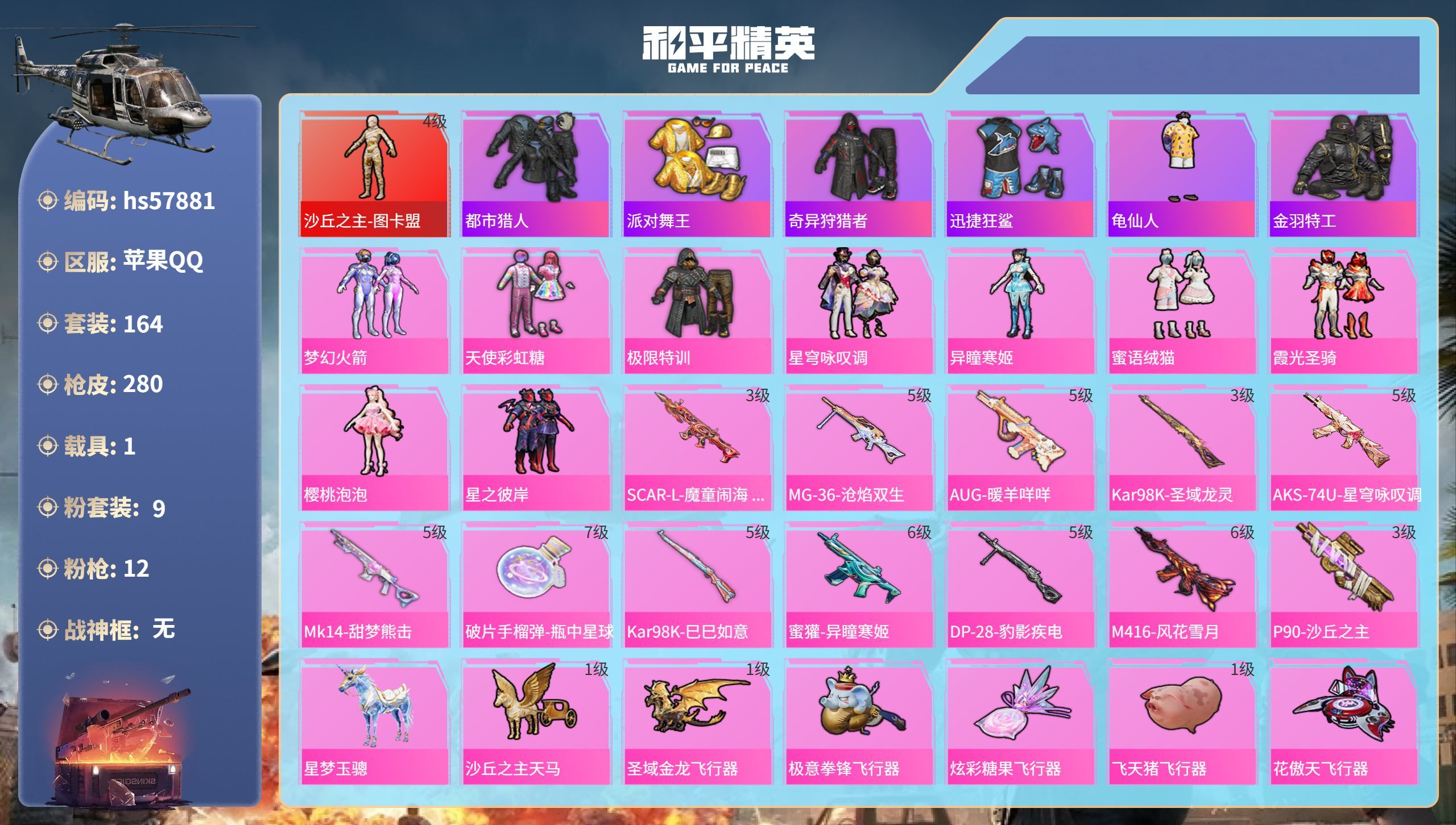 hs55198 苹果手Q-11王牌印记-16粉装-14特效枪-3载具-136304热力值-282套装