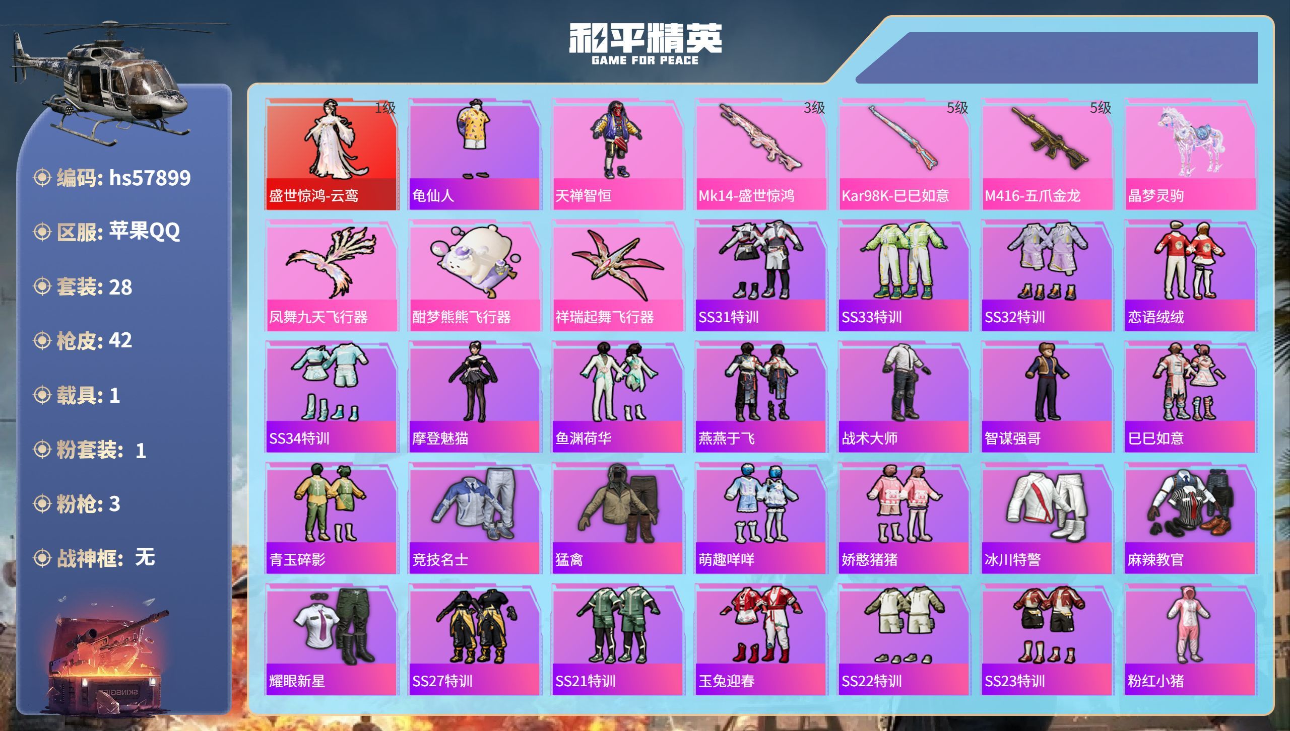 hs57899 苹果手Q-2王牌印记-1红装-1粉装-3特效枪-1载具-15707热力值-28套装-