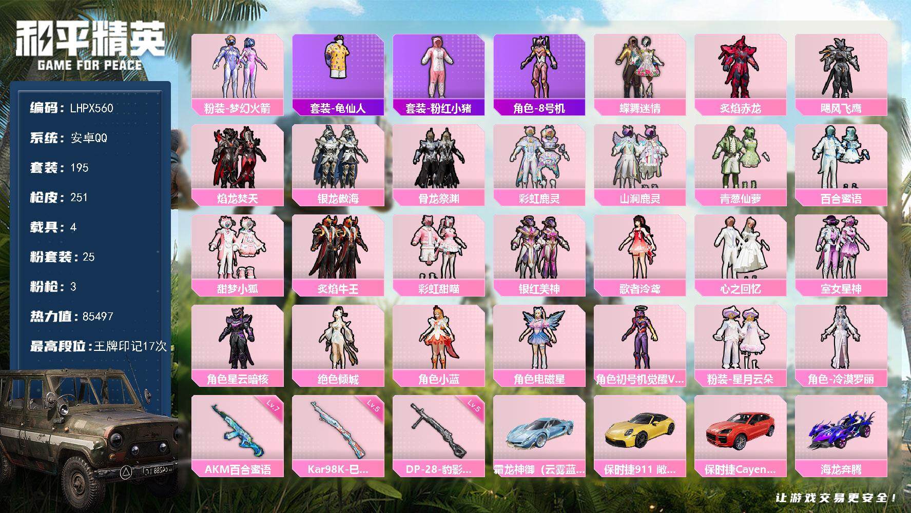 安卓 手Q-3粉装-5特效枪-1载具-1粉色飞行器-59268热力值-15王牌