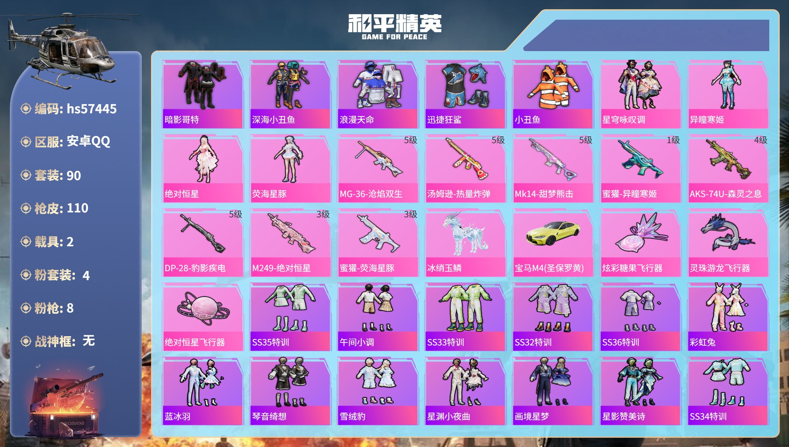 hs57445 安卓手Q-4王牌印记-4粉装-8特效枪-2载具-34269热力值-90套装-110枪