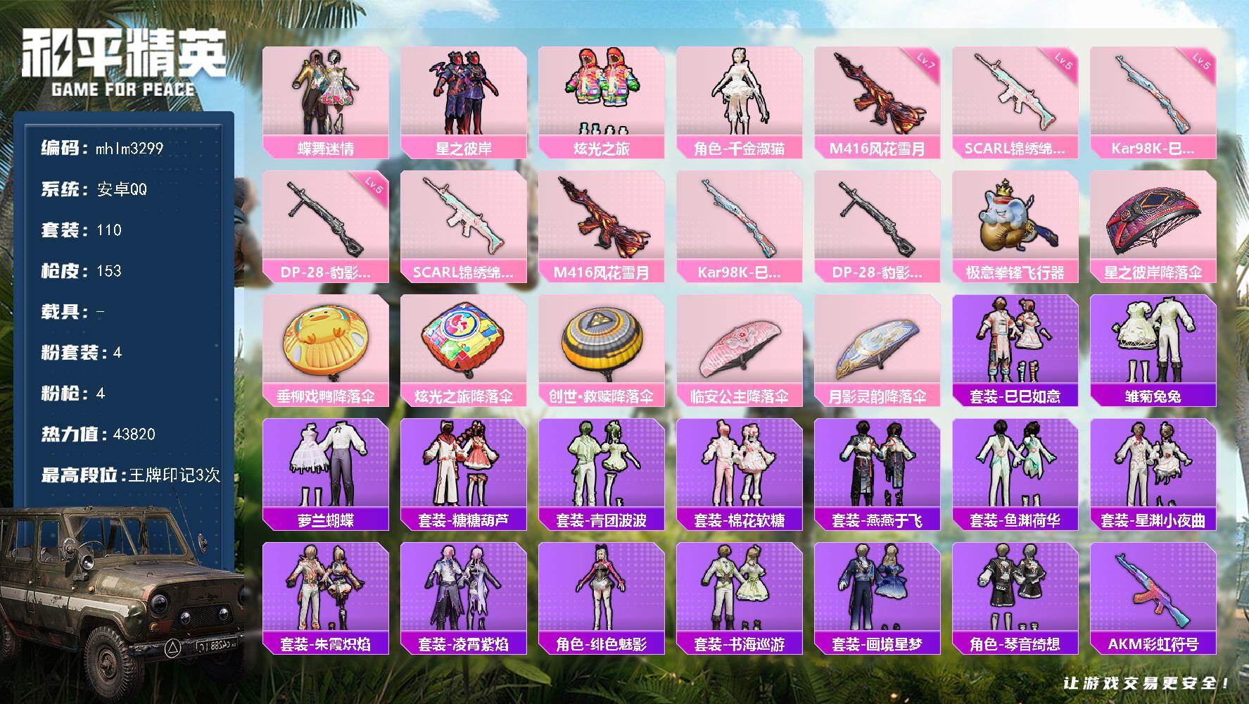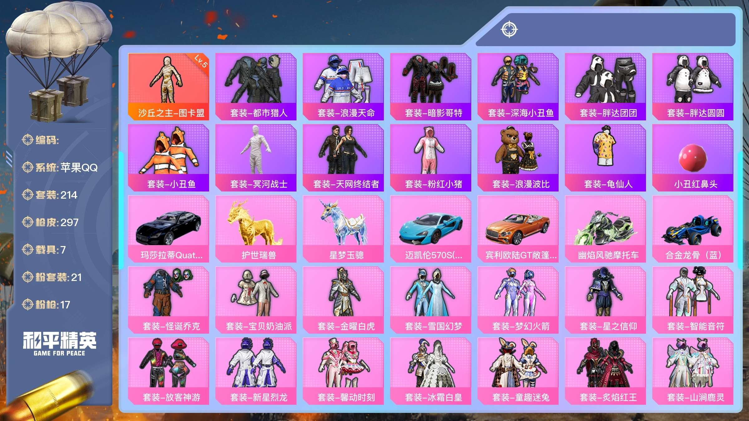 a4223/苹果QQ/热力值:113566,1神装,20粉装,17粉枪,7载具,33粉色战备,214