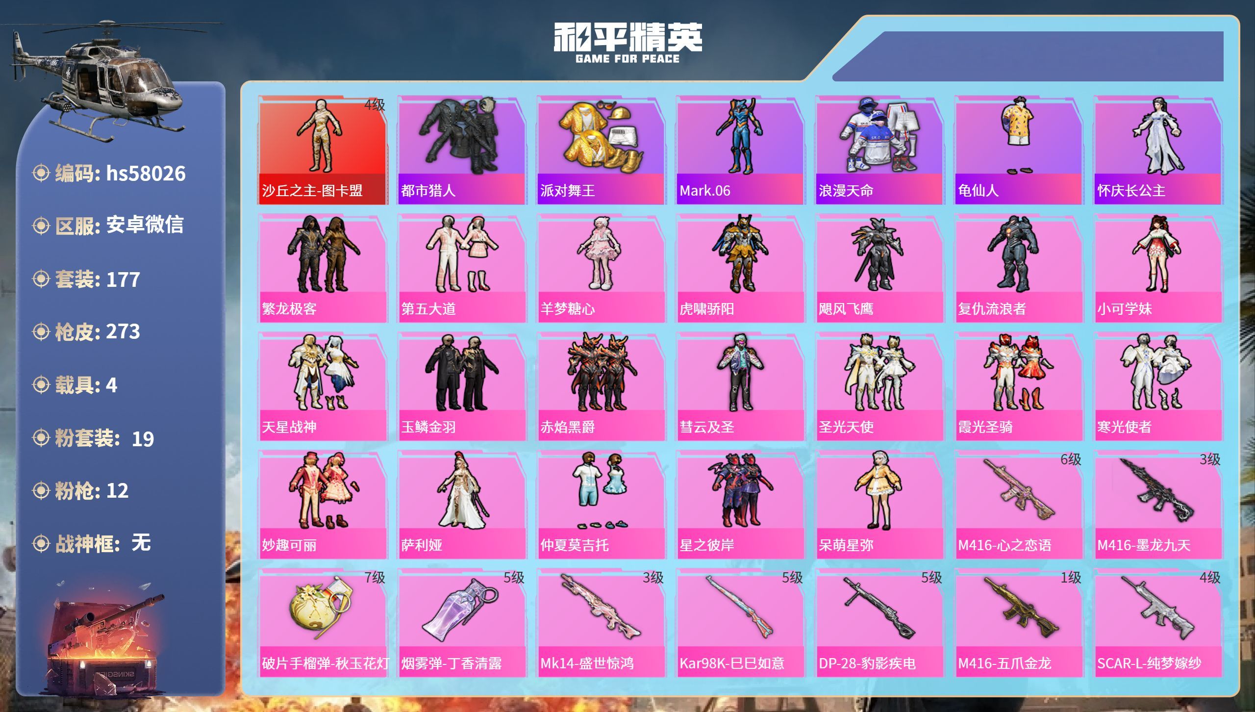 a4222/安卓v/热力值:160334,1神装,23粉装,26粉枪,10载具,51粉色战备,26