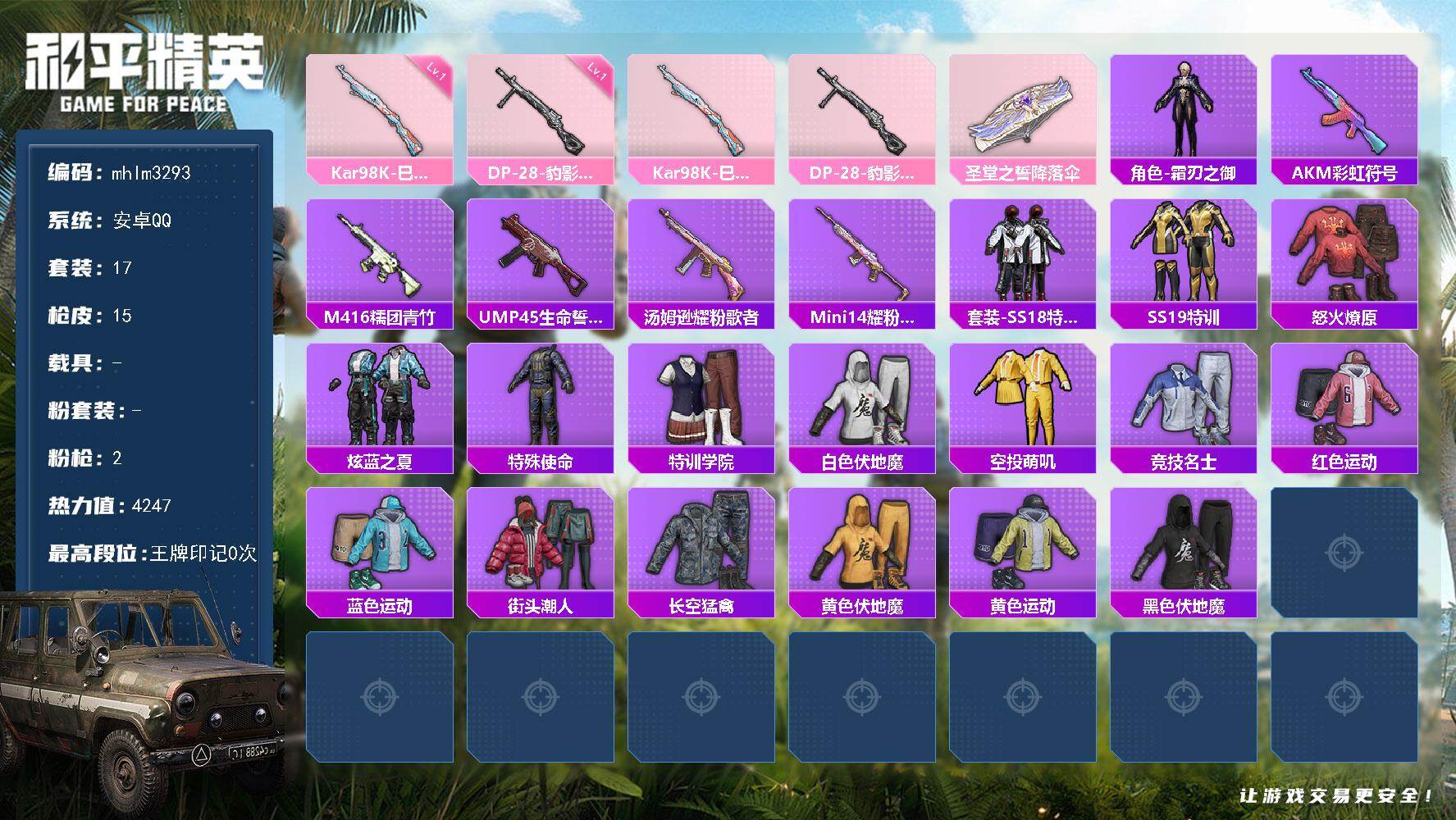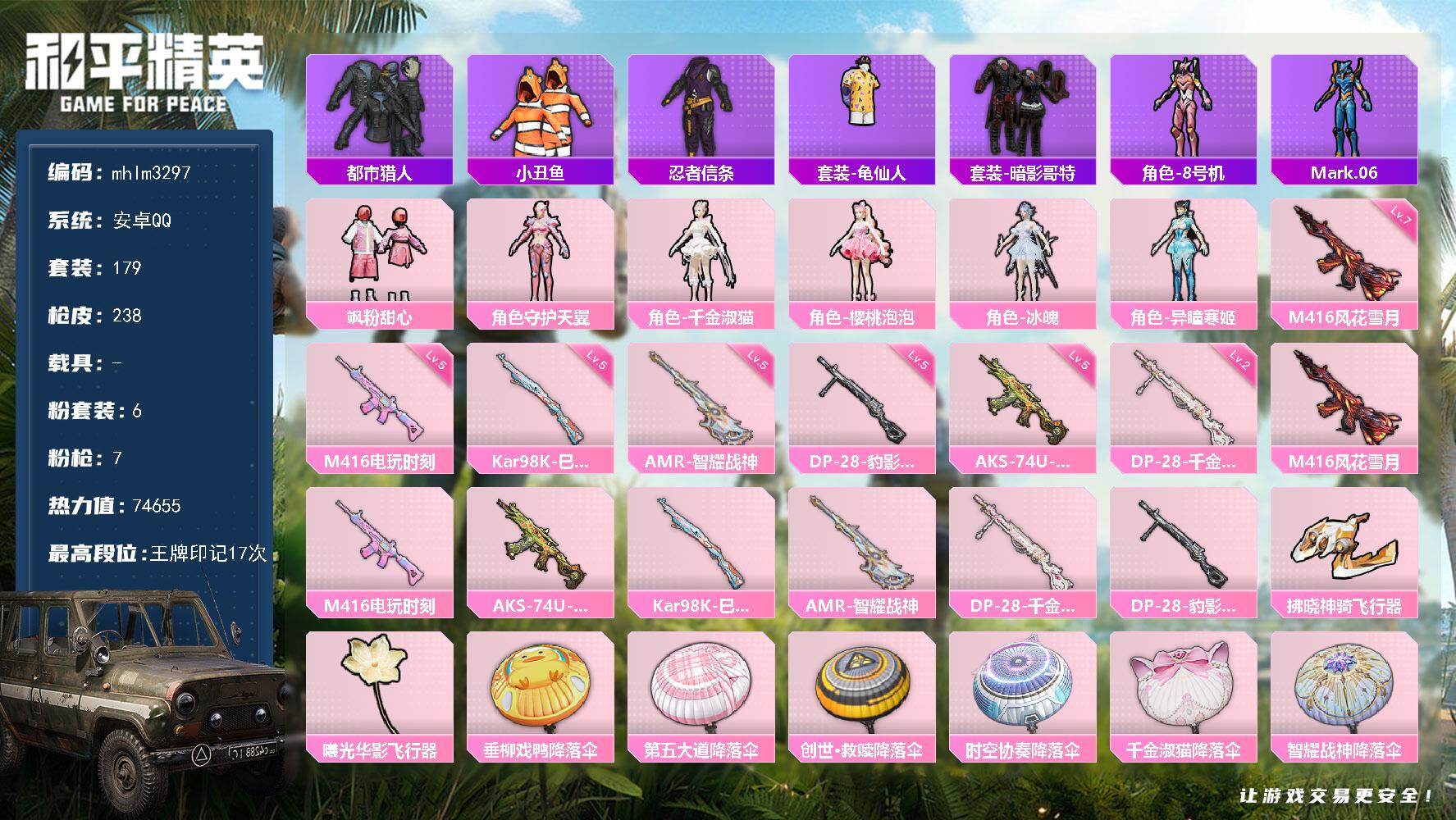 a4227/安卓v/热力值:75947,12粉装,11粉枪,2载具,19粉色战备,181套装,19
