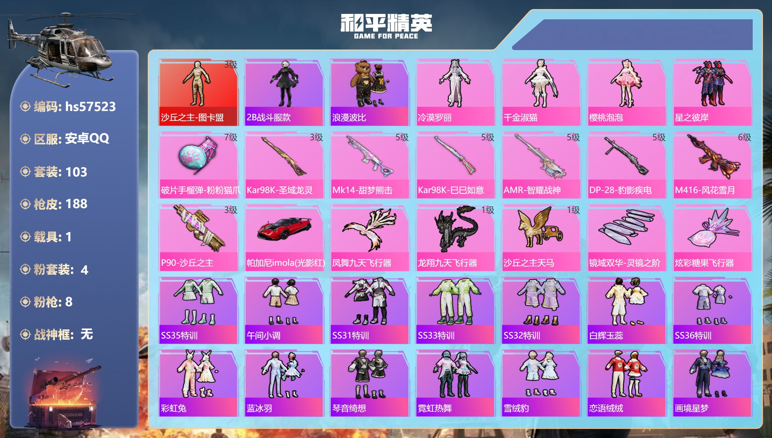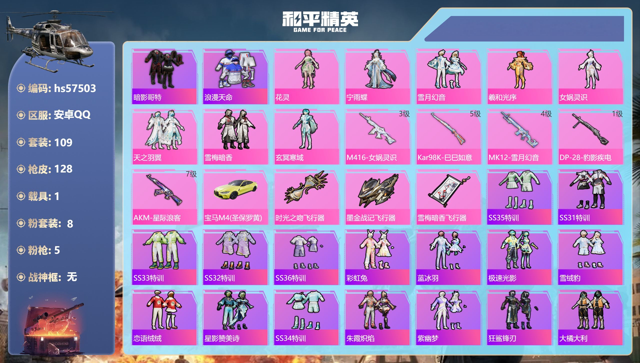 hs57503 安卓手Q-4王牌印记-8粉装-5特效枪-1载具-43455热力值-109套装-128