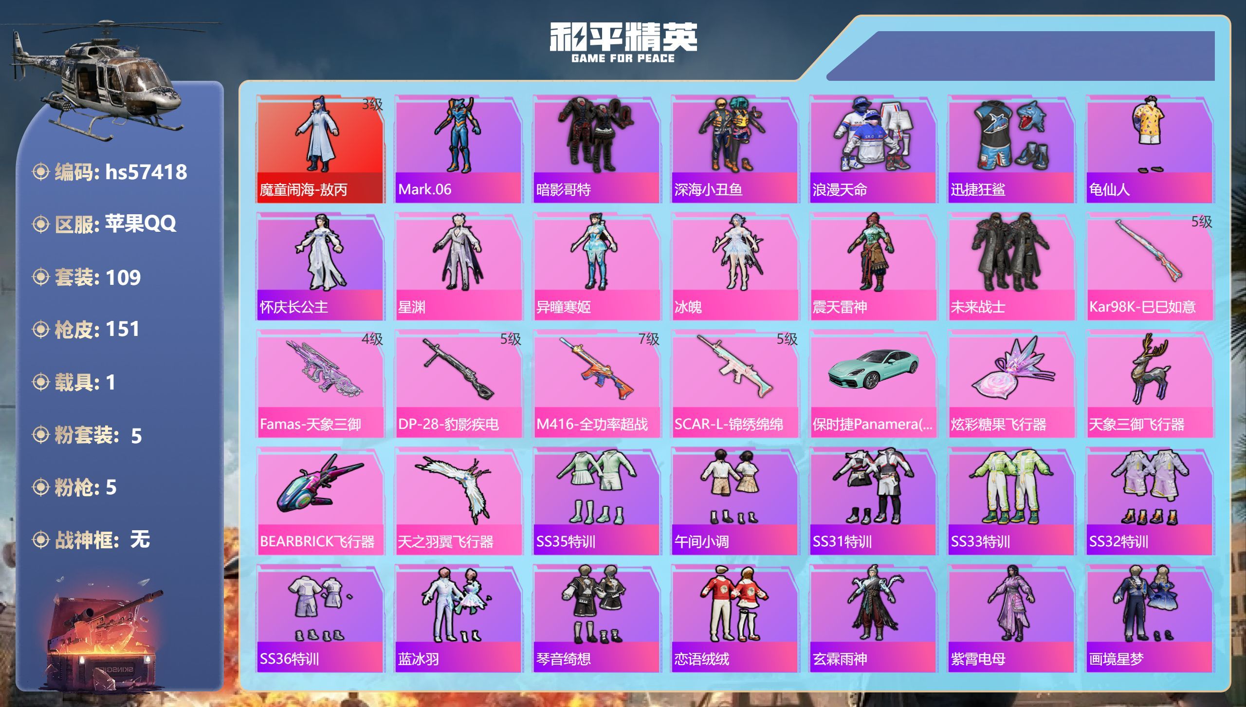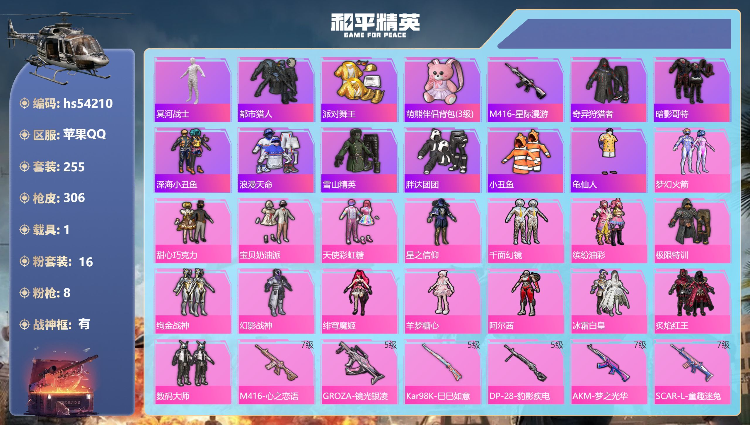 hs54210 苹果手Q-27王牌印记-有战神框-16粉装-8特效枪-1载具-99676热力值-25