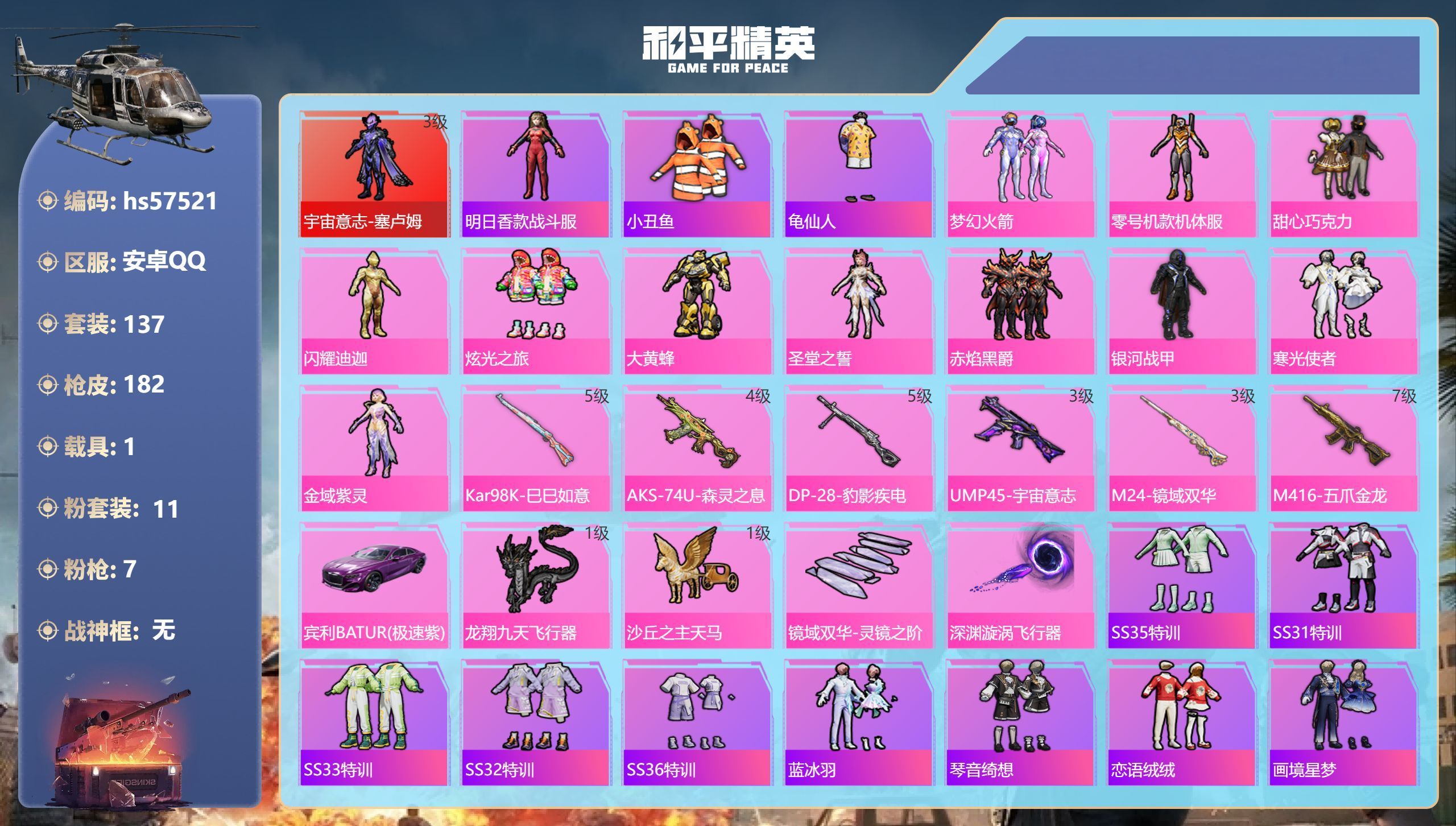 hs55773 安卓手Q-13王牌印记-7粉装-5特效枪-1载具-57982热力值-136套装-17