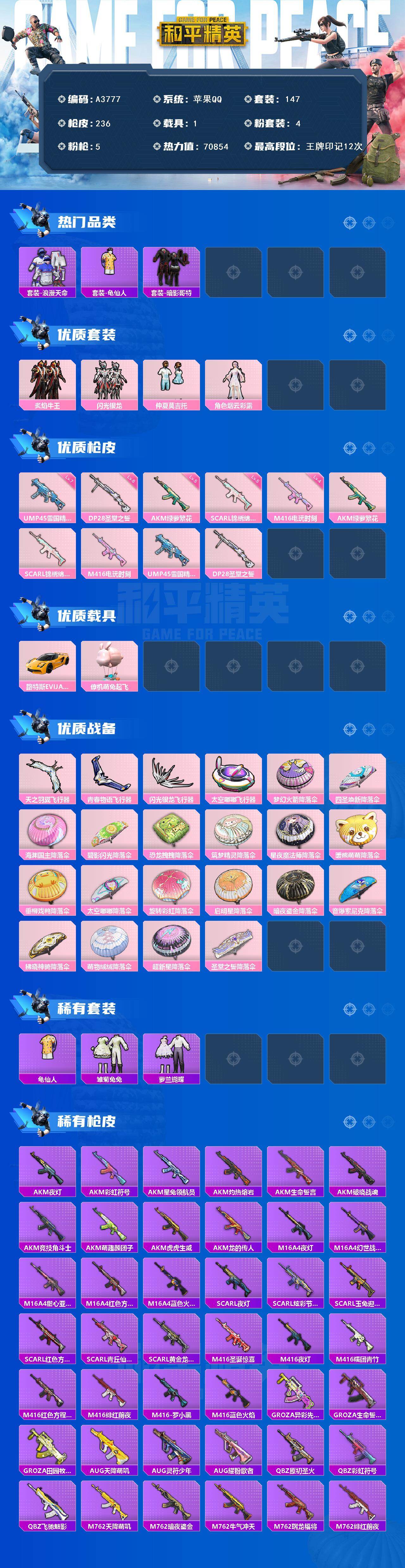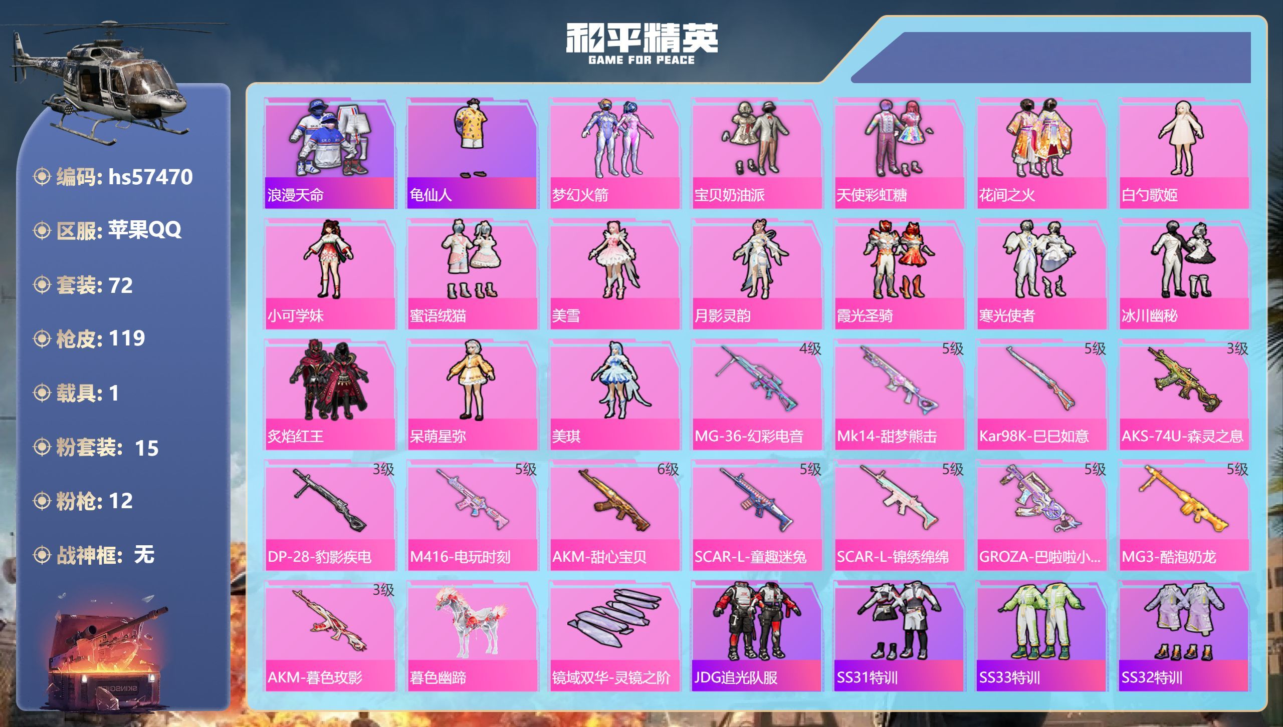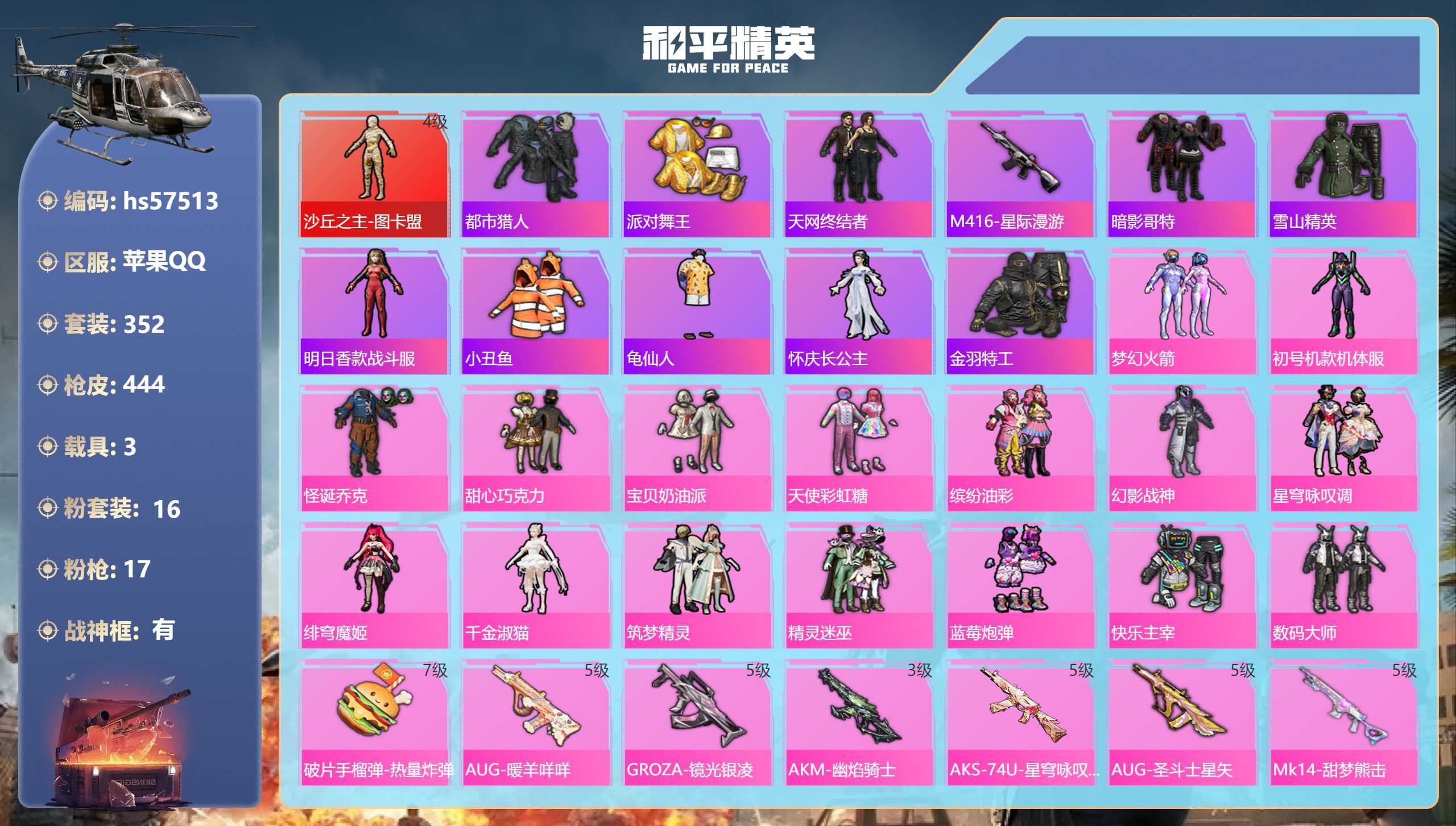 hs57528 苹果手Q-12王牌印记-5粉装-9特效枪-1载具-57893热力值-124套装-19