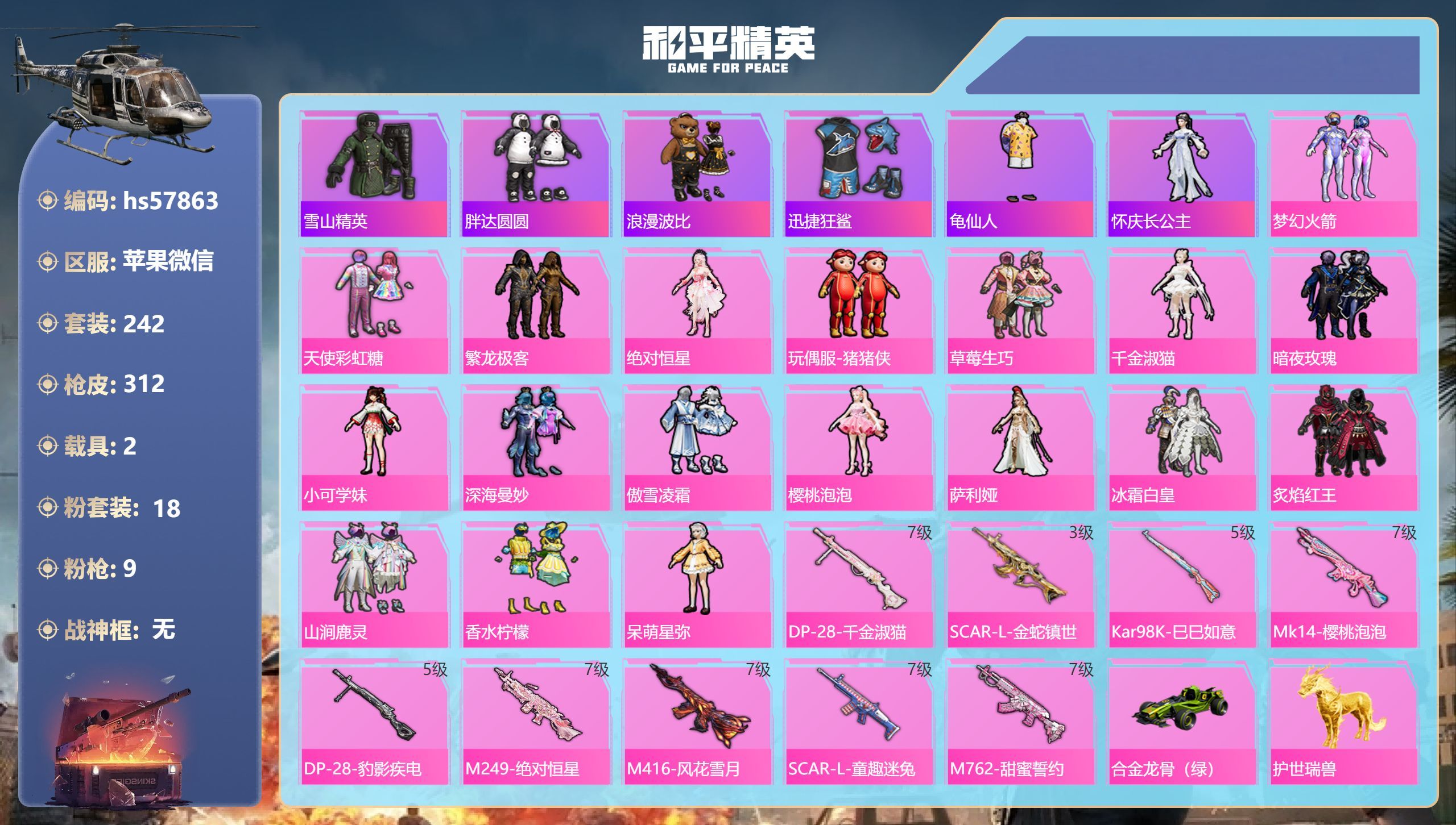 hs57863 苹果v-23王牌印记-18粉装-9特效枪-2载具-117523热力值-242套装-