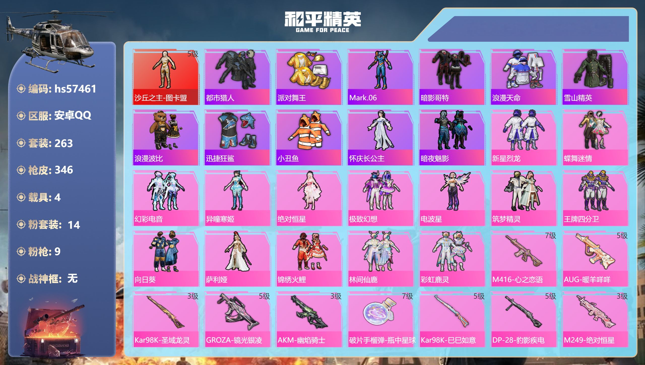 hs57461 安卓手Q-16王牌印记-1红装-14粉装-9特效枪-4载具-122261热力值-26
