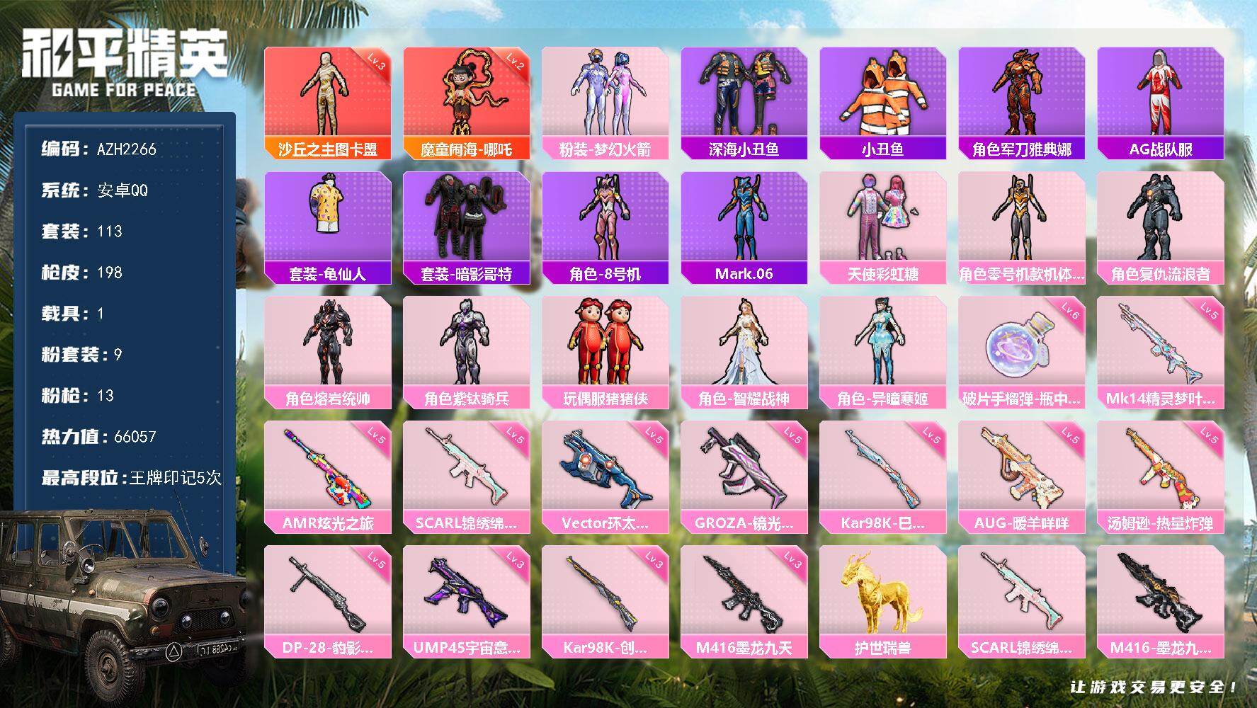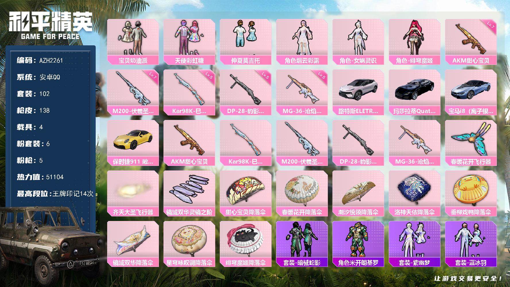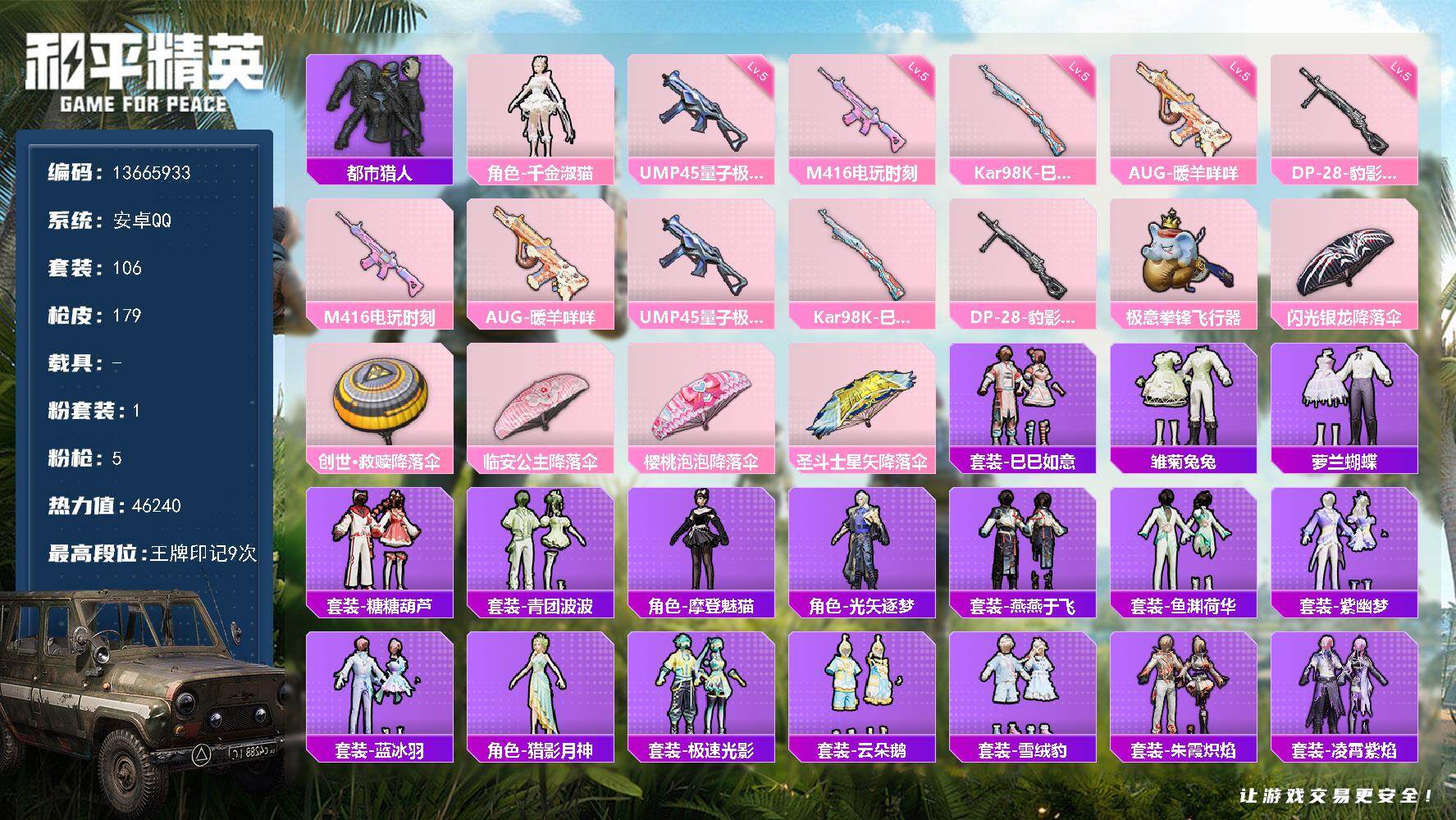 安卓 手Q-4粉装-8特效枪-0载具-1粉色飞行器-38400热力值-2王牌印