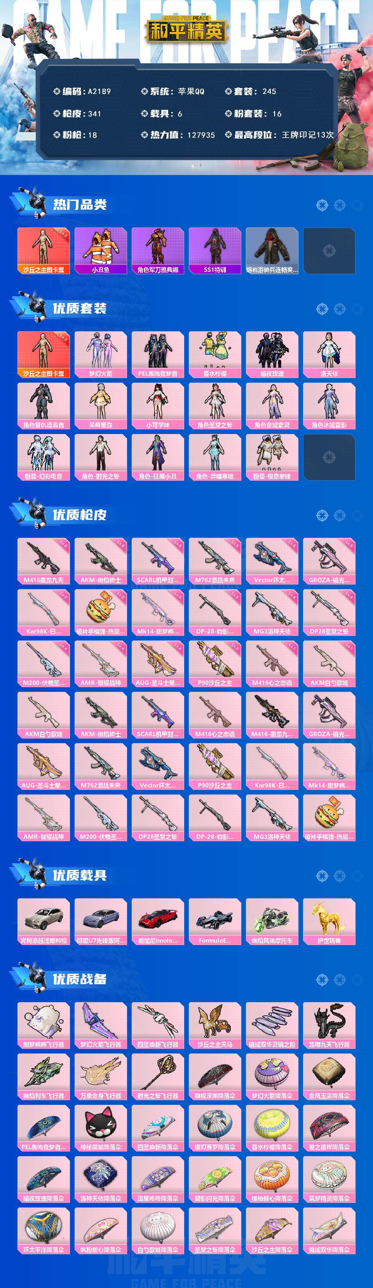 hs51955 苹果手Q-14王牌印记-14粉装-10特效枪-4载具-106886热力值-242套装