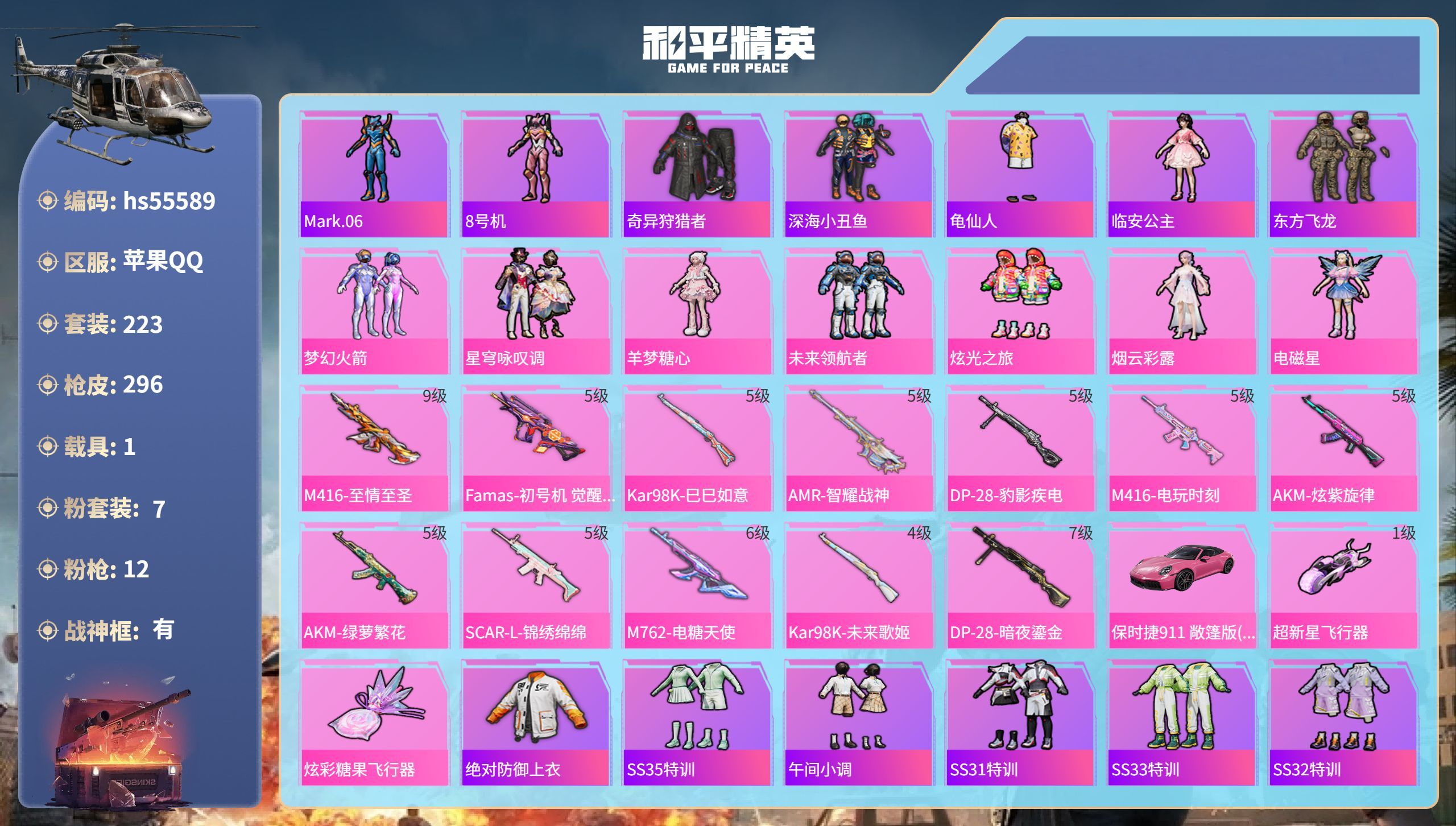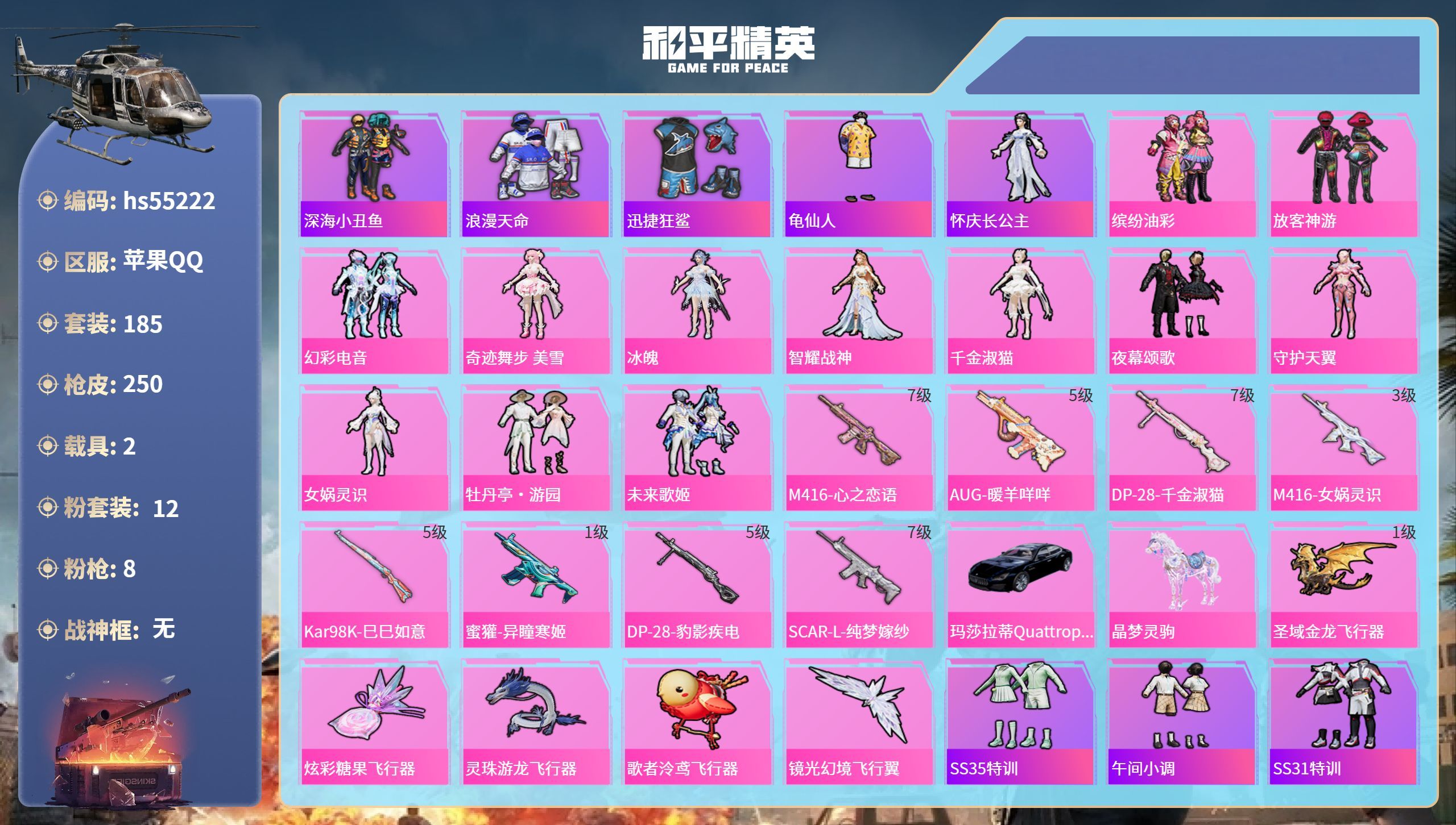 hs55222 苹果手Q-18王牌印记-12粉装-8特效枪-2载具-86989热力值-185套装-2