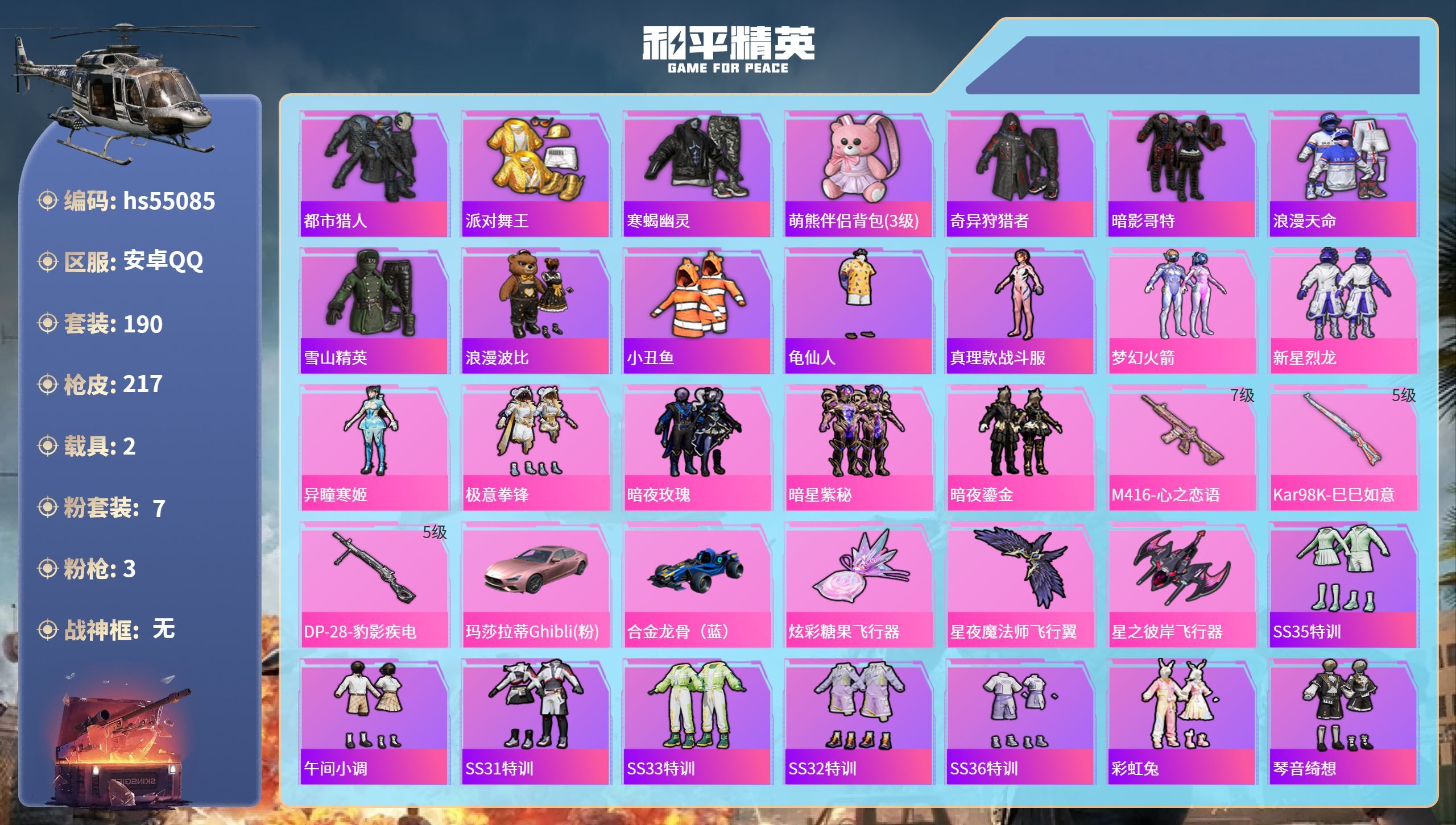 hs55085 安卓手Q-16王牌印记-7粉装-3特效枪-2载具-71065热力值-190套装-21