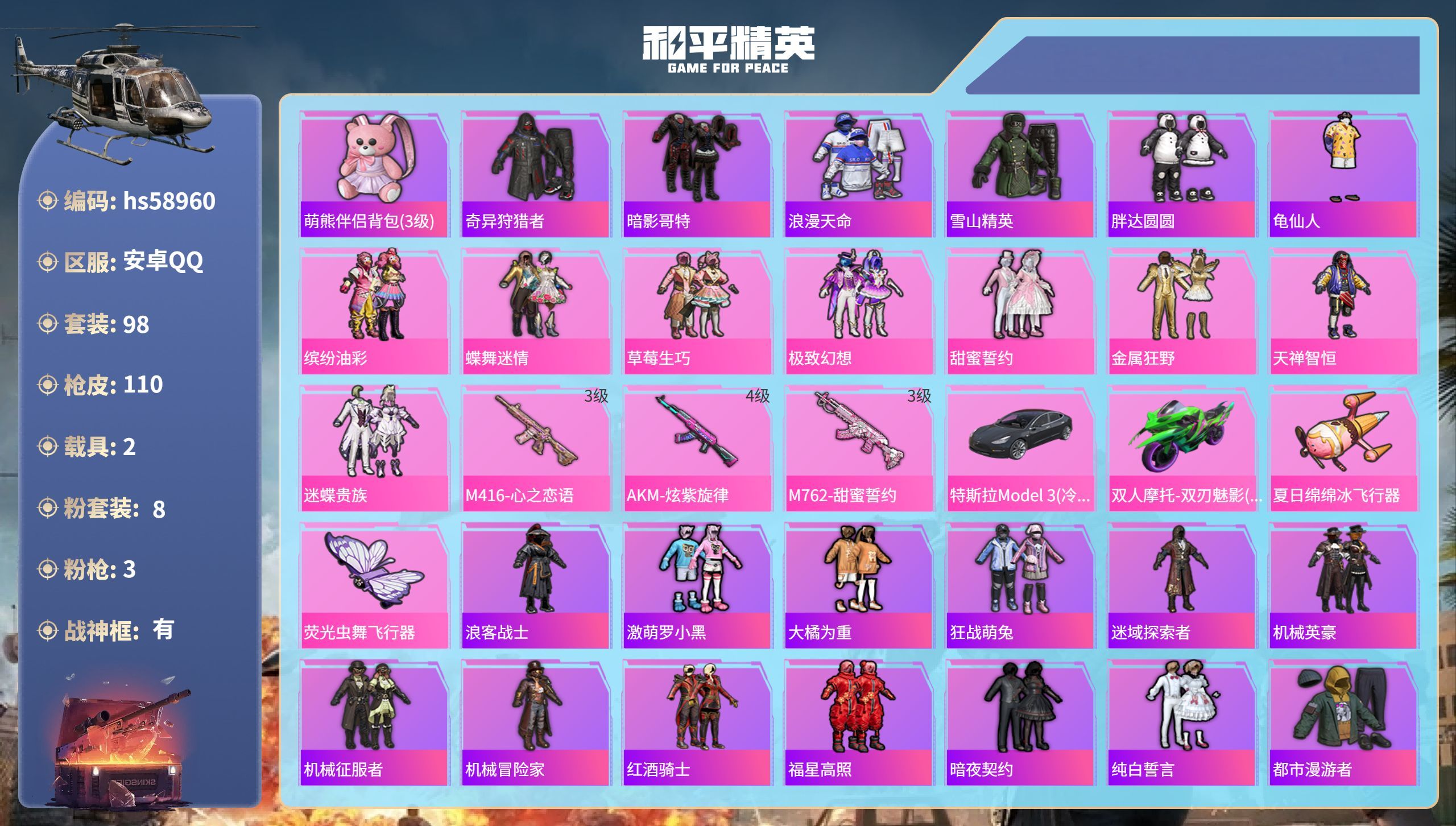 hs58960安卓手Q-7王牌印记-有战神框-8粉装-3特效枪-2载具-49142热力值-98套装