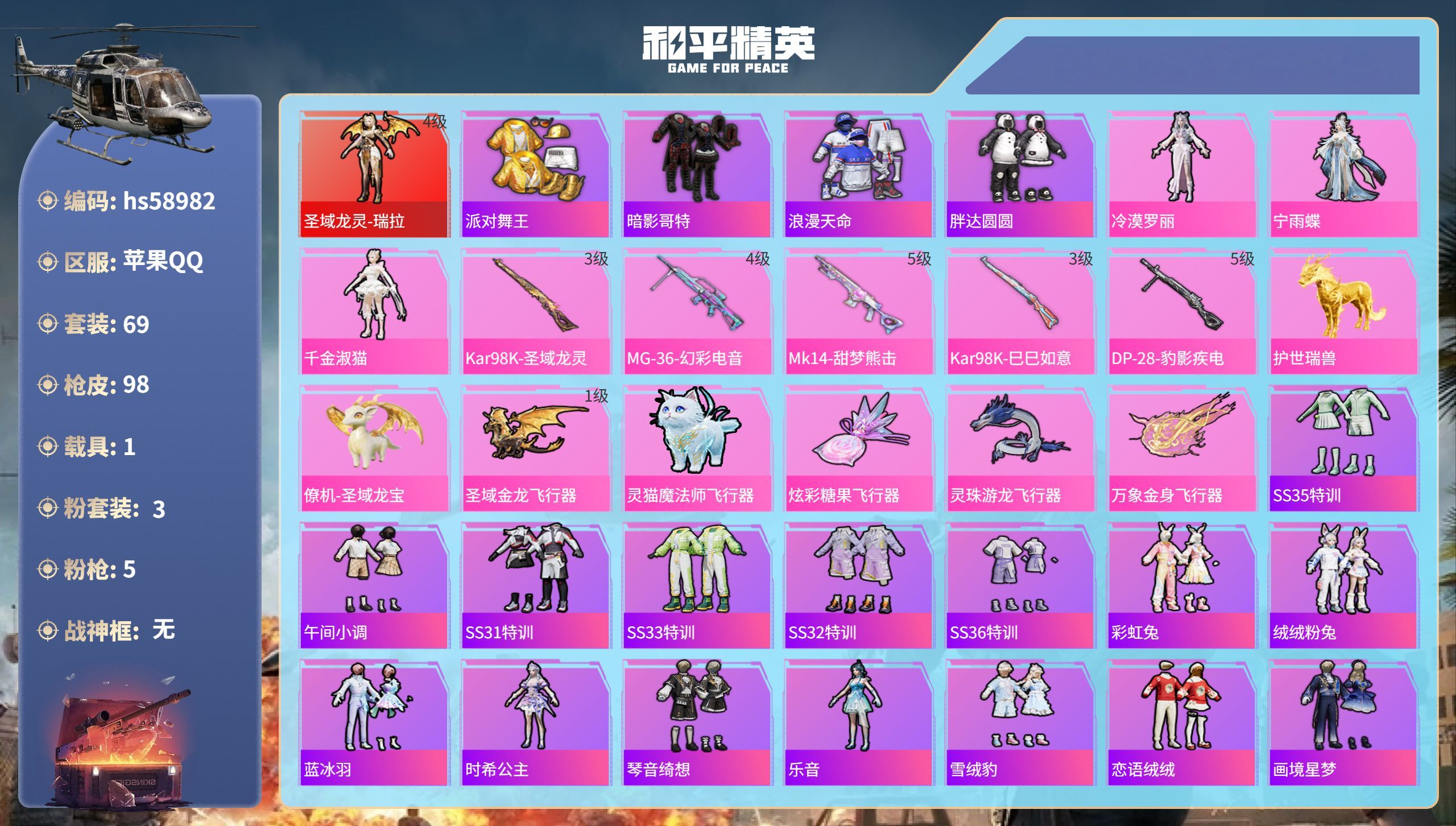 hs58982苹果手Q-5王牌印记-1红装-3粉装-5特效枪-1载具-35927热力值-69套装-