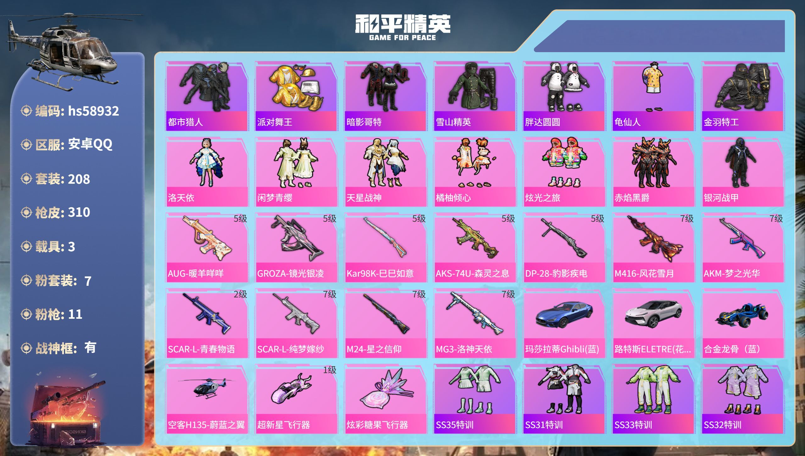 hs58932安卓手Q-20王牌印记-有战神框-7粉装-11特效枪-3载具-102458热力值-2