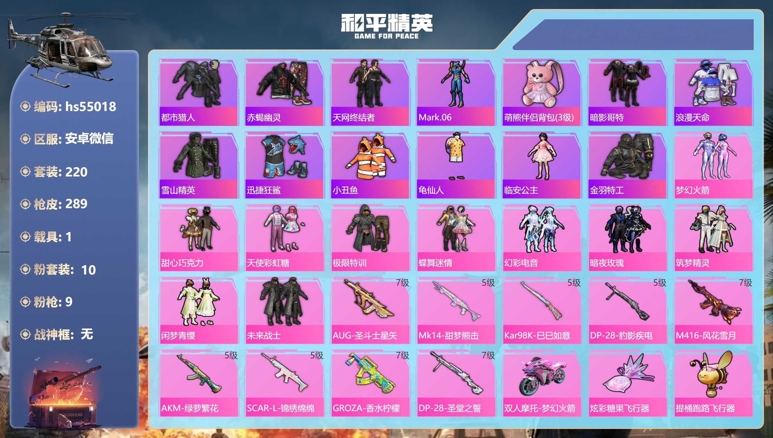 hs55018 安卓v-14王牌印记-10粉装-9特效枪-1载具-94582热力值-220套装-2