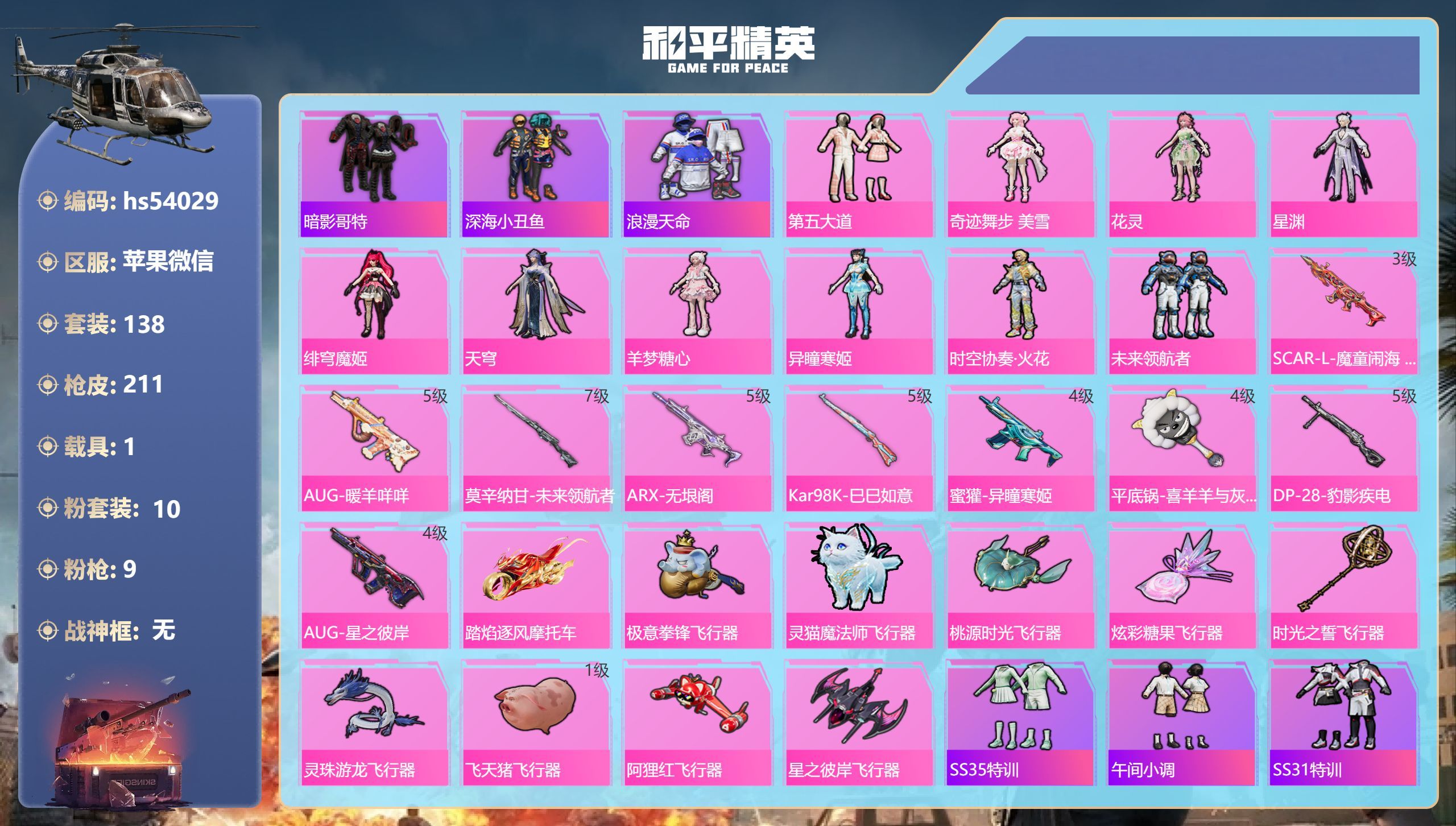 hs54029 苹果v-2王牌印记-10粉装-9特效枪-1载具-69143热力值-138套装-21