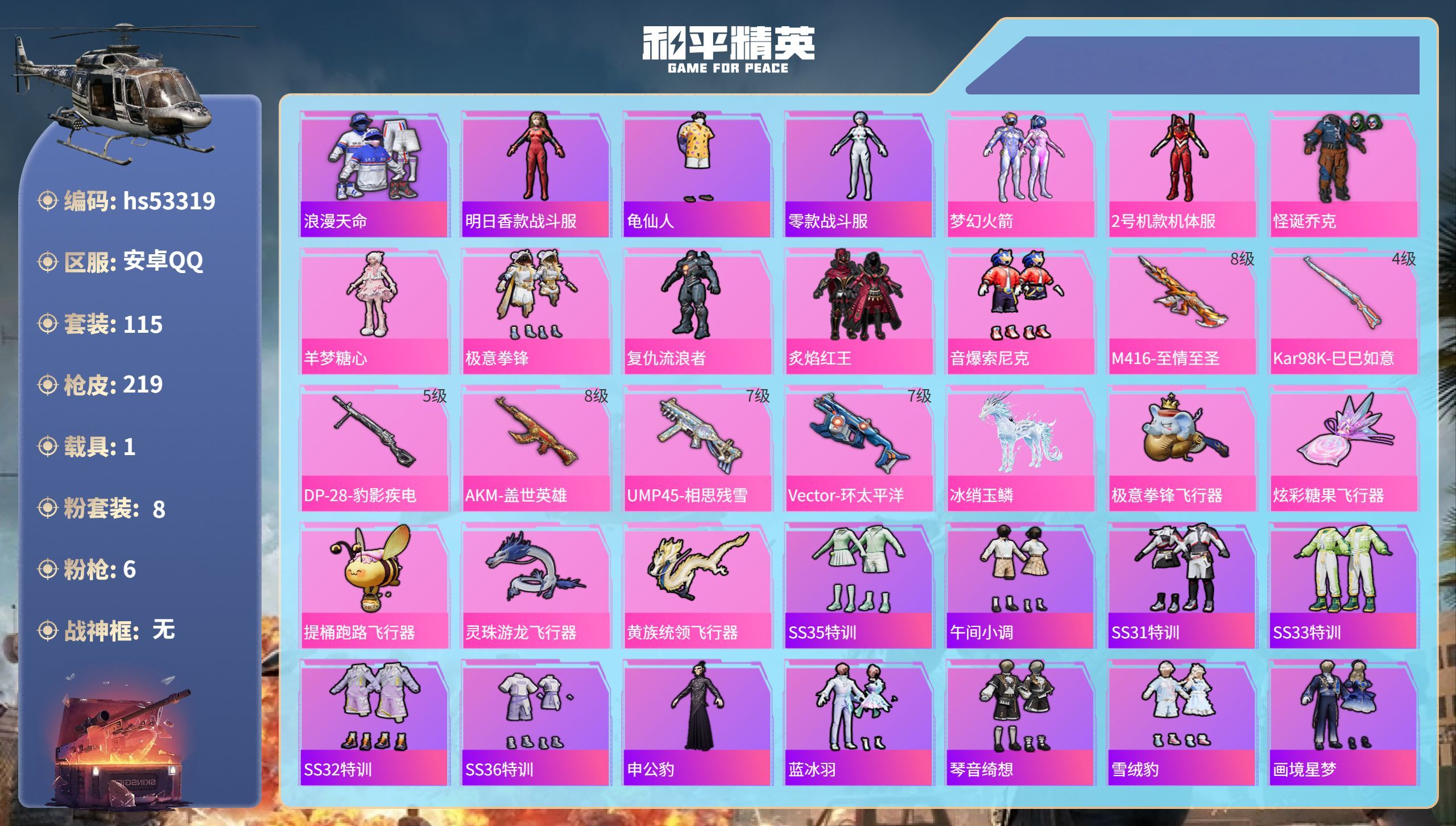 hs53319 安卓手Q-12王牌印记-8粉装-6特效枪-1载具-热力值-115套装-21