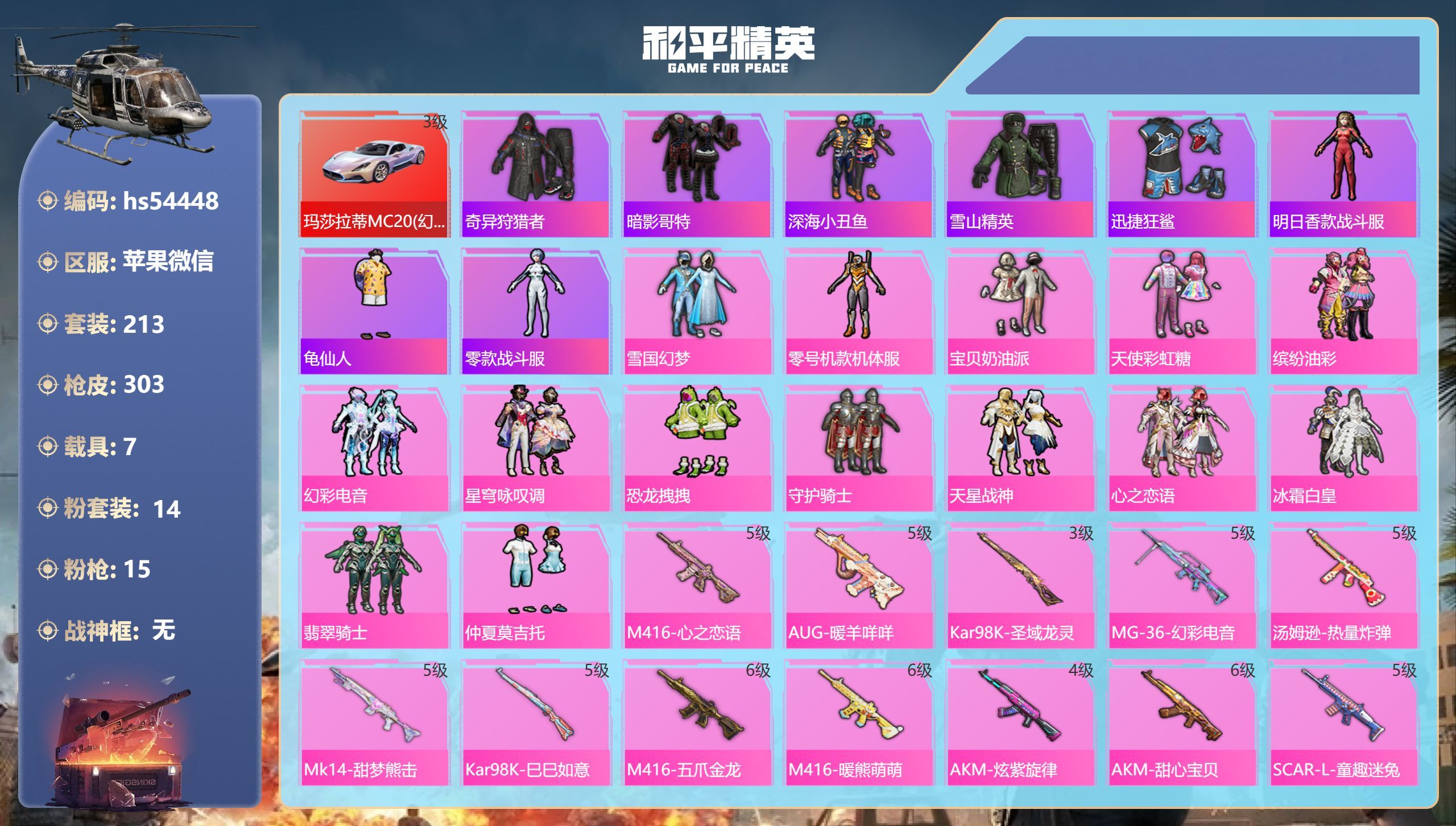 hs54448 苹果v-25王牌印记-14粉装-15特效枪-7载具-热力值-213套装