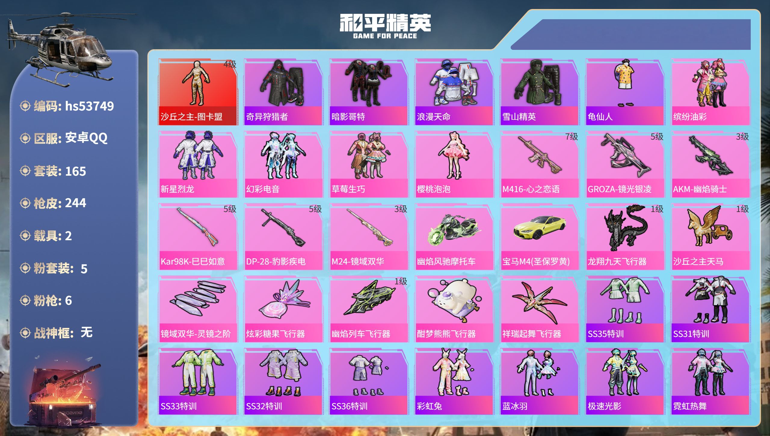 hs53050 安卓手Q-25王牌印记-有战神框-26粉装-18特效枪-5载具-111111热力值-