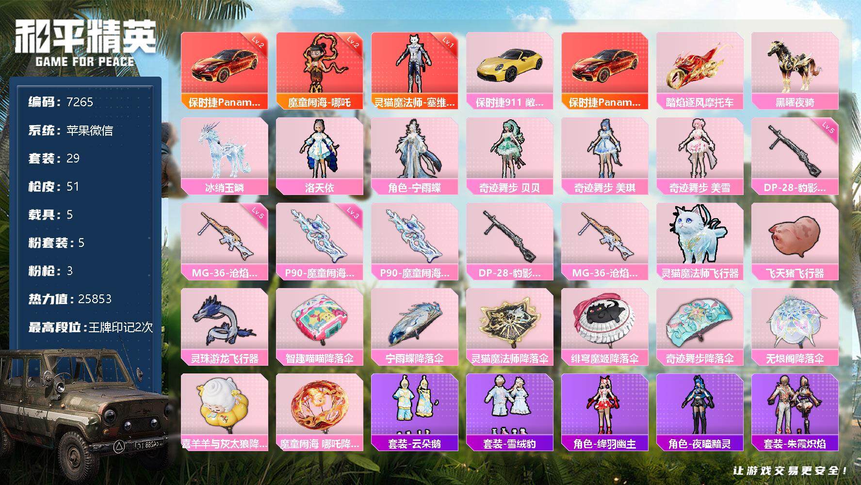 【7265】苹果 微信-5粉装-3特效枪-5载具-25853热力值-2印记-2