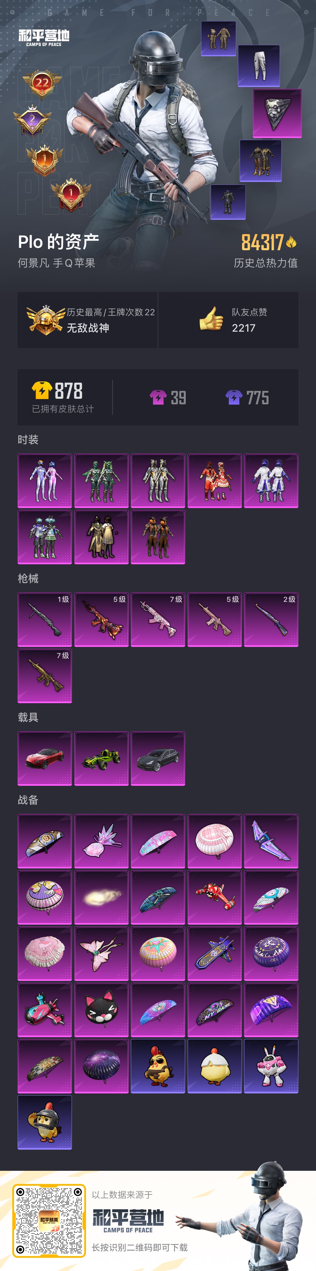 hs52335 苹果手Q-22王牌印记-有战神框-6粉装-7特效枪-3载具-77418热力值-156