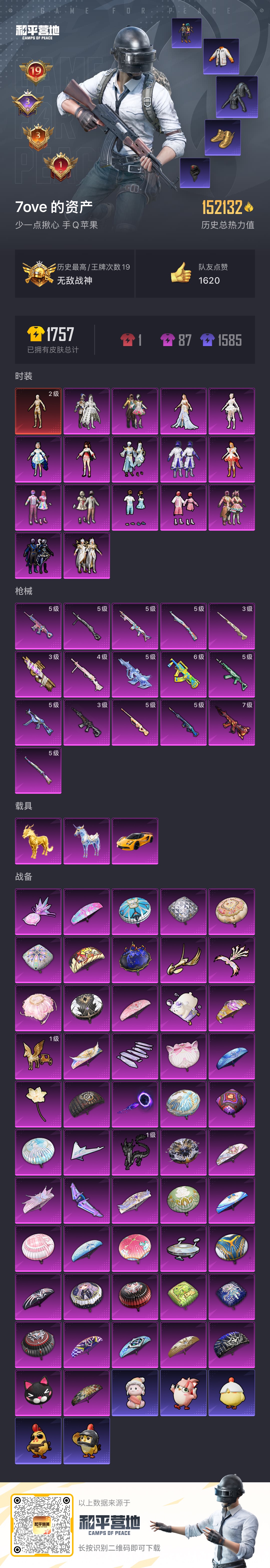 hs52107 苹果手Q-15王牌印记-18粉装-17特效枪-6载具-150850热力值-315套装