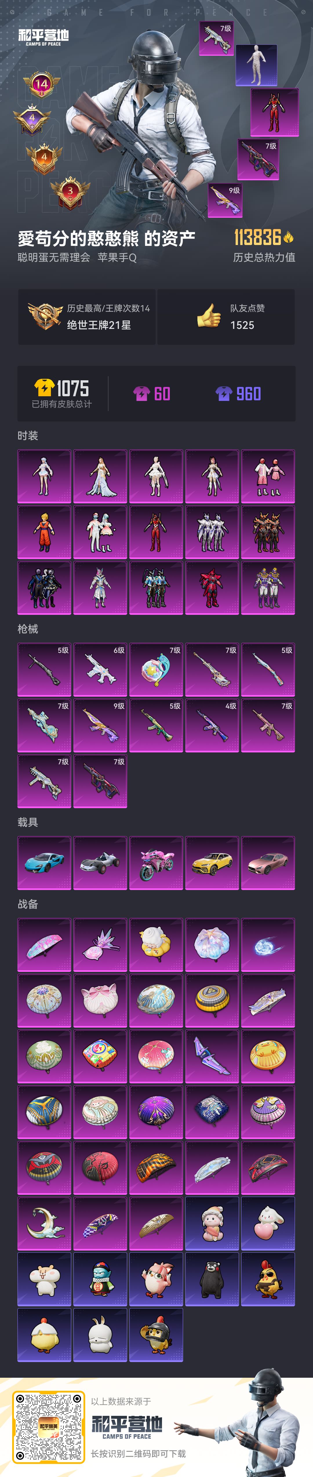 hs51433 苹果手Q-12王牌印记-8粉装-8特效枪-3载具-70093热力值-153套装-21