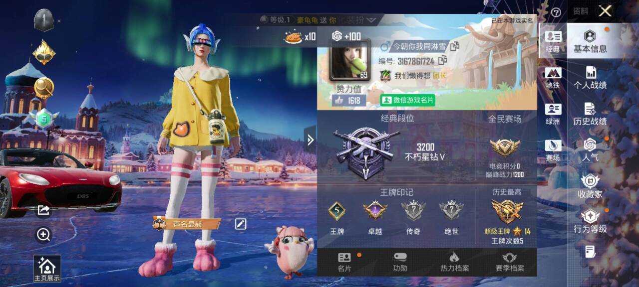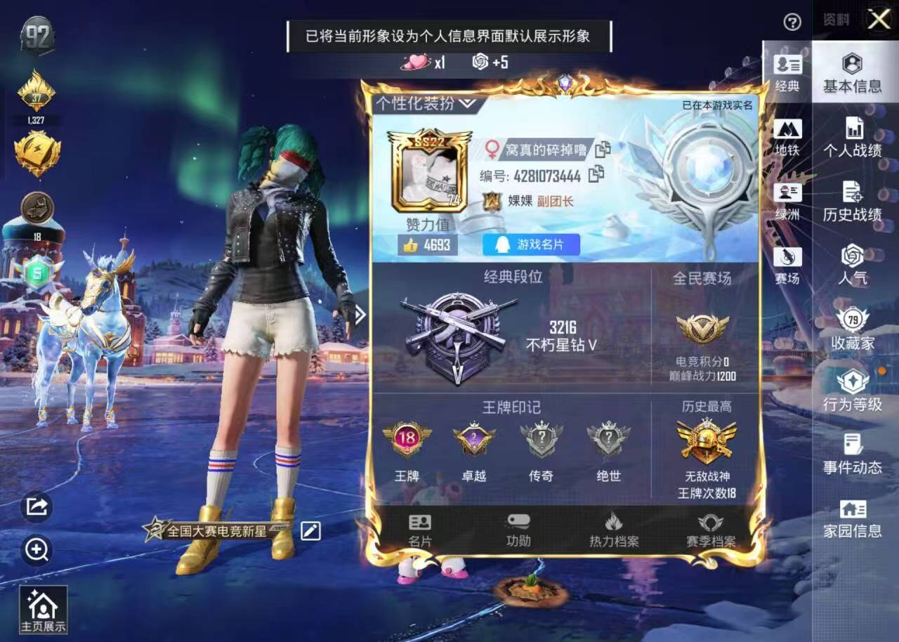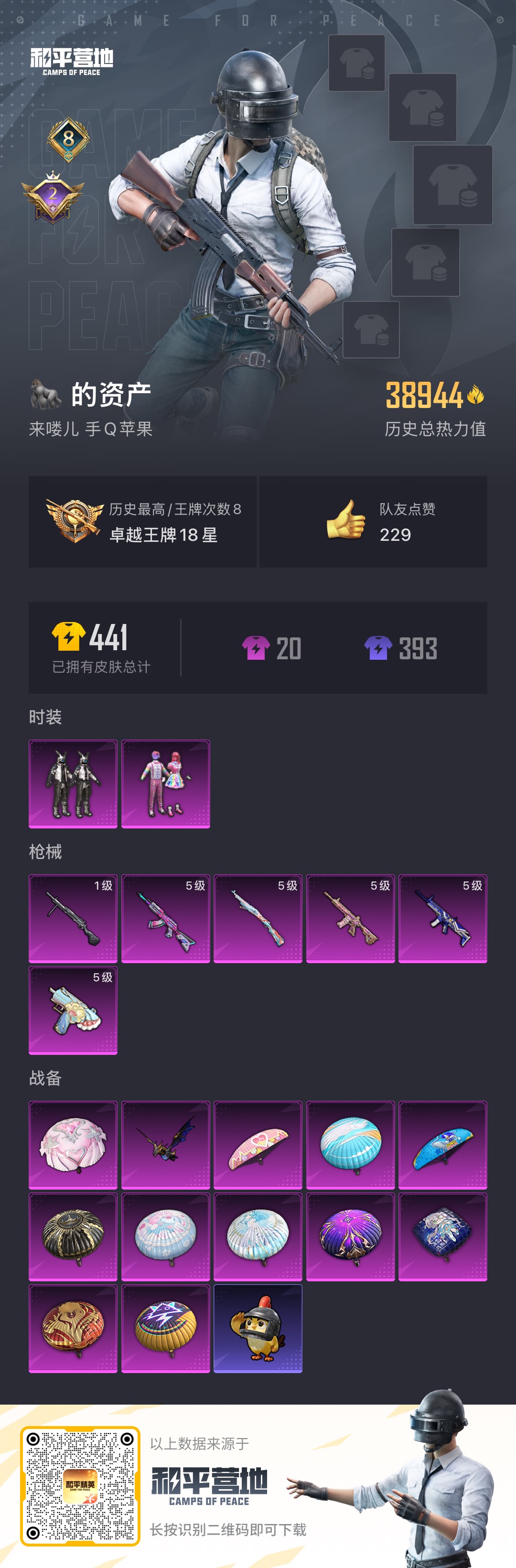 时装数: 73 载具数: 1 枪械数: 84 战备数: 55 热门装扮: 千金