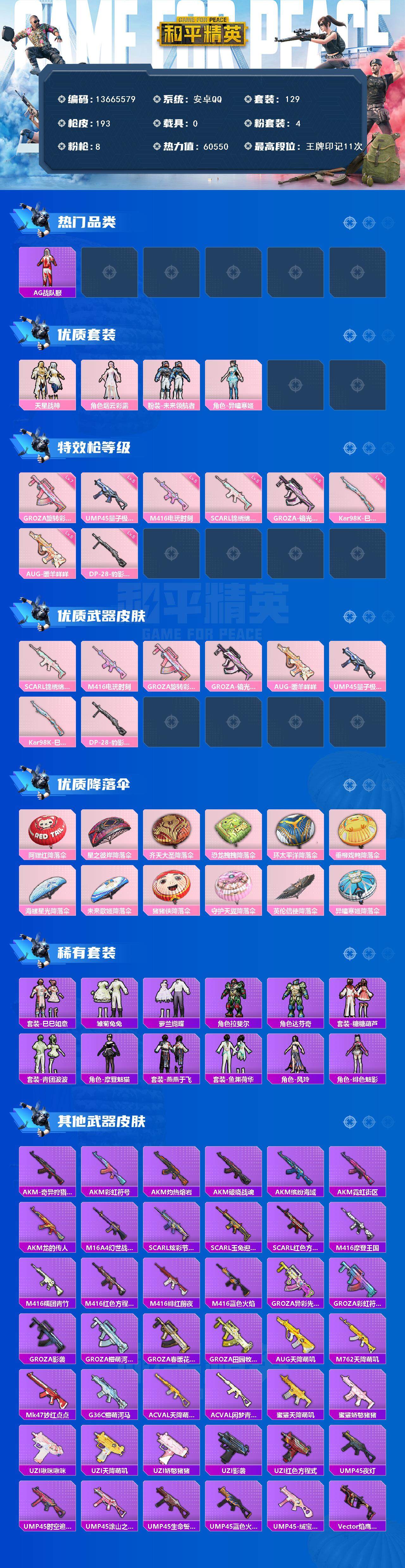 hs50167 安卓手Q-14王牌印记-5粉装-3特效枪-1载具-62835热力值-172套装-20