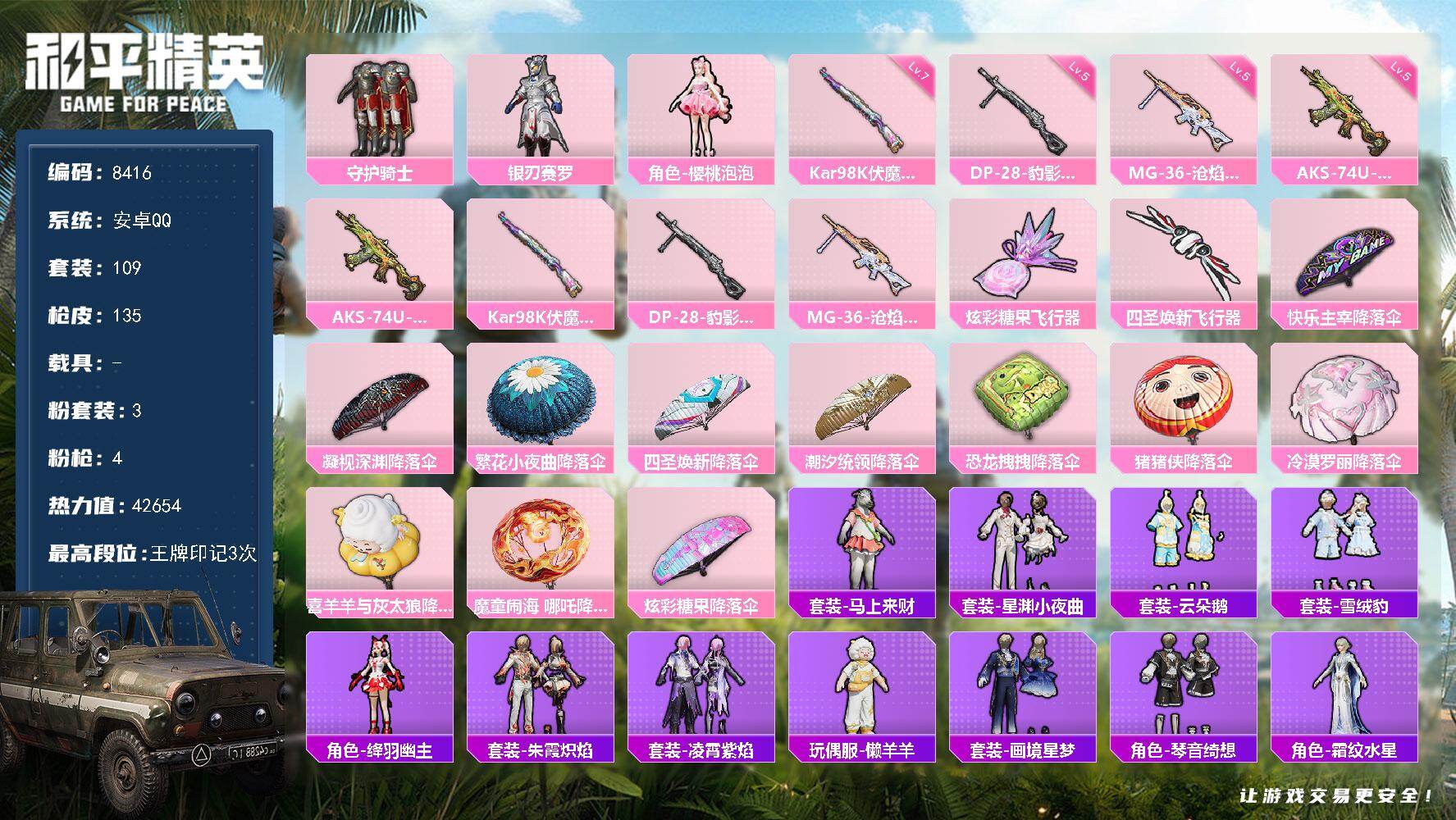可二次【特价出售/店主推荐】安卓 手Q-1神装-10粉装-9特效枪-3载具-7