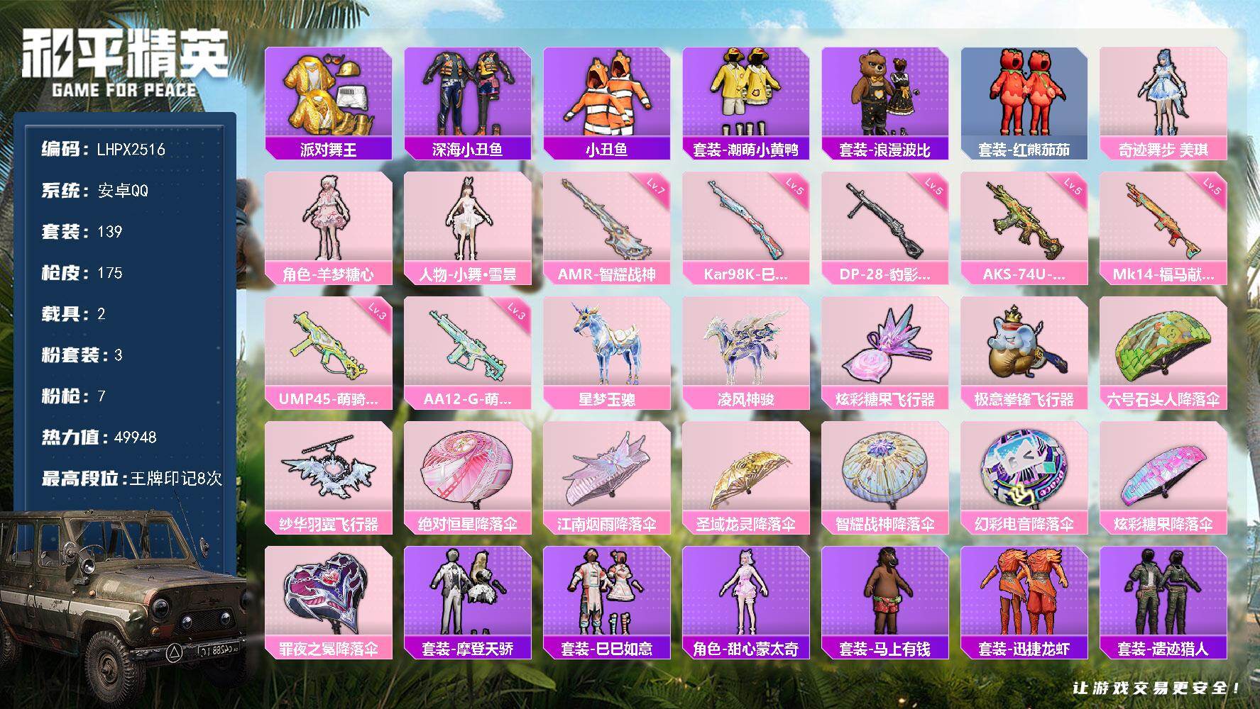 【秒换绑】安卓 手Q-8粉装-4特效枪-0载具-2粉色飞行器-42322热力值