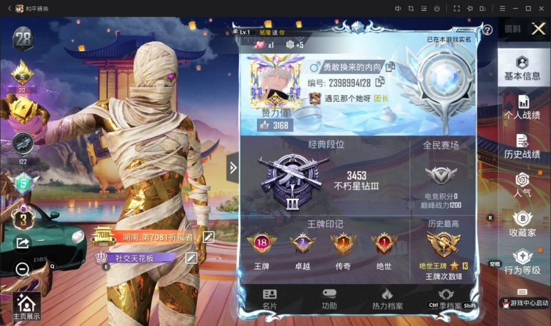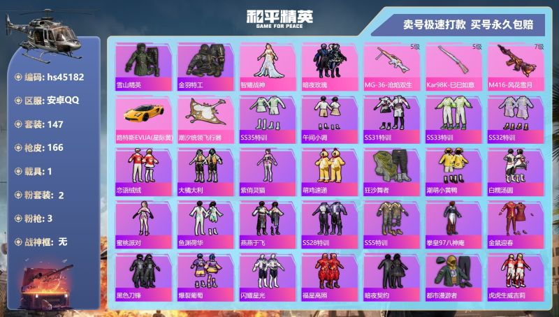 a3173/安卓QQ/-6王牌印记-13粉装-6特效枪-0载具-49261热力值-119套装-144