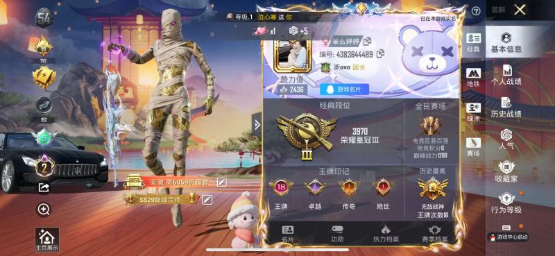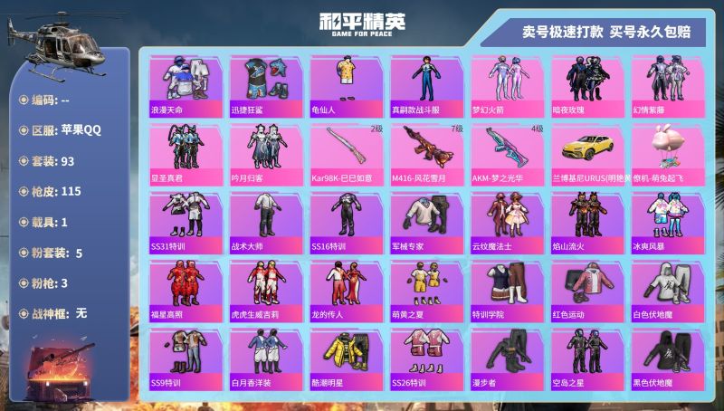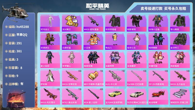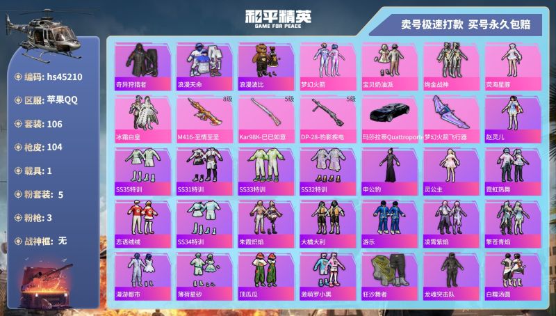 hs45426 苹果手Q-6王牌印记-5粉装-3特效枪-1载具-39549热力值-93套装-115枪